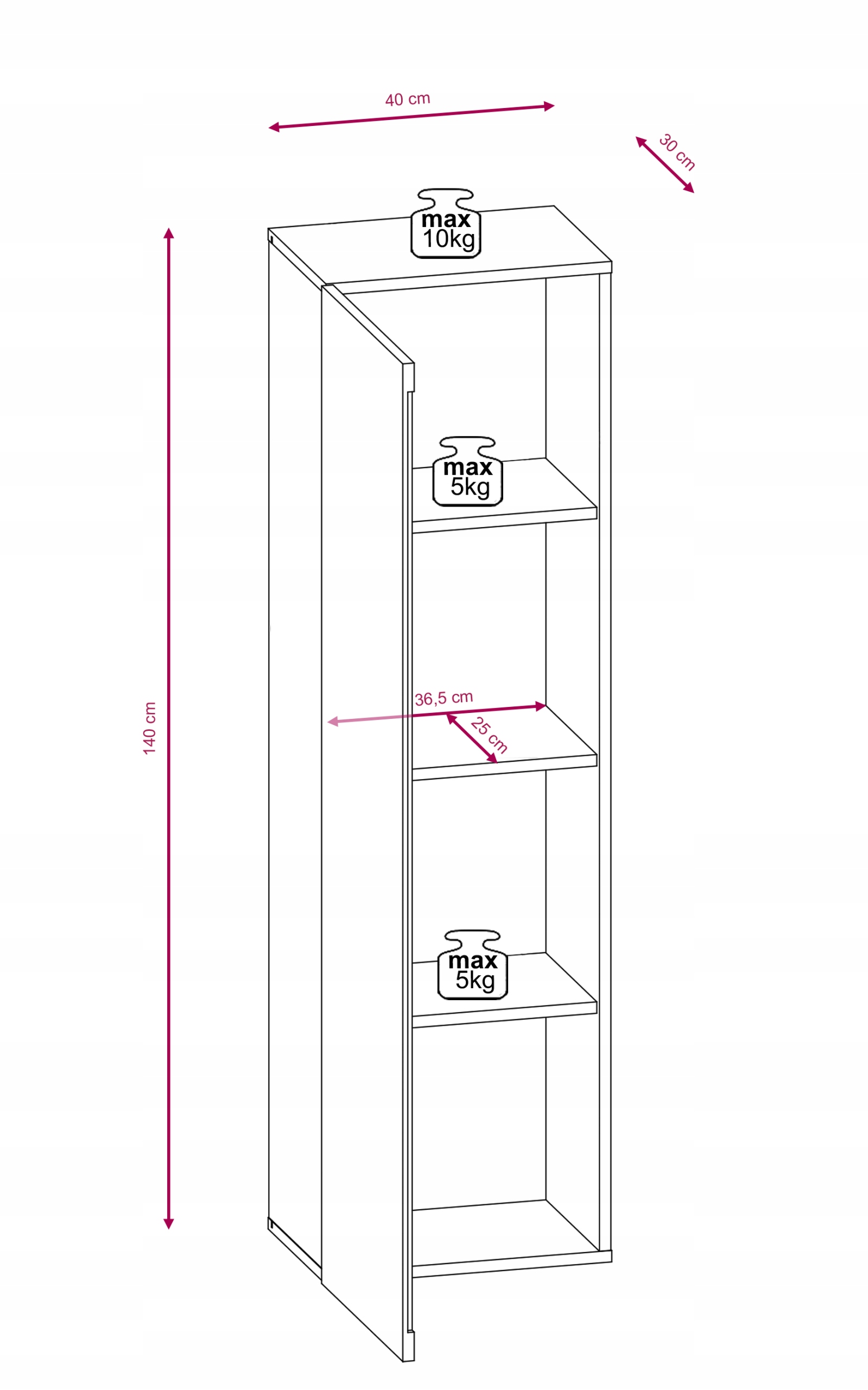 - Wymiary: 140 x 40 x 30 cm (wys. x szer. x gł.)