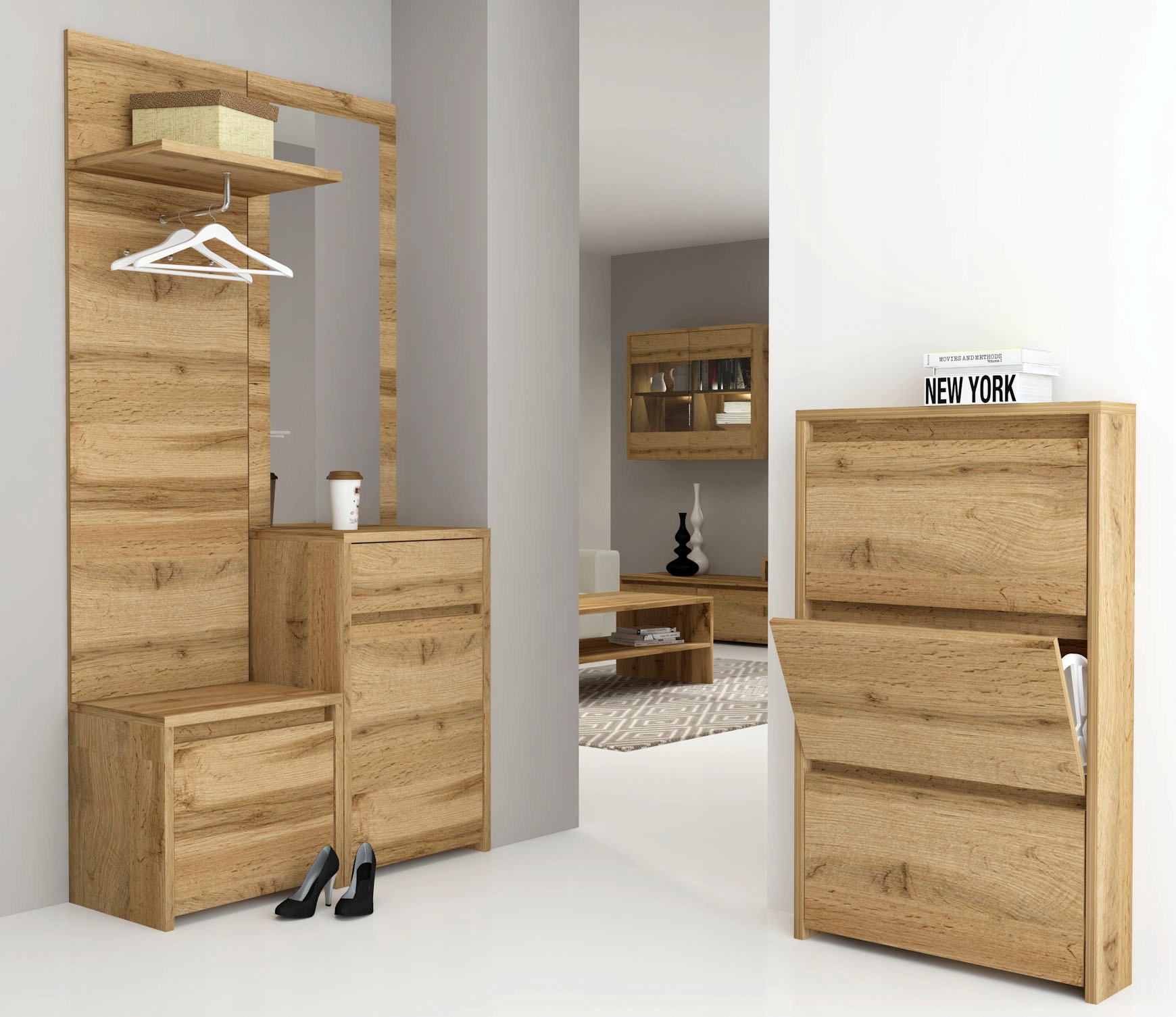 Mebel wyposażony jest w praktyczny schowek z uchylnymi drzwiami oraz funkcjonalną szufladę, co zapewnia miejsce do przechowywania drobiazgów i elementów garderoby. Konstrukcja została zaprojektowana z myślą o codziennym komforcie – optymalna wysokość siedziska ułatwia zmianę obuwia, a solidne mocowania oraz prowadnice gwarantują stabilność i trwałość użytkowania.