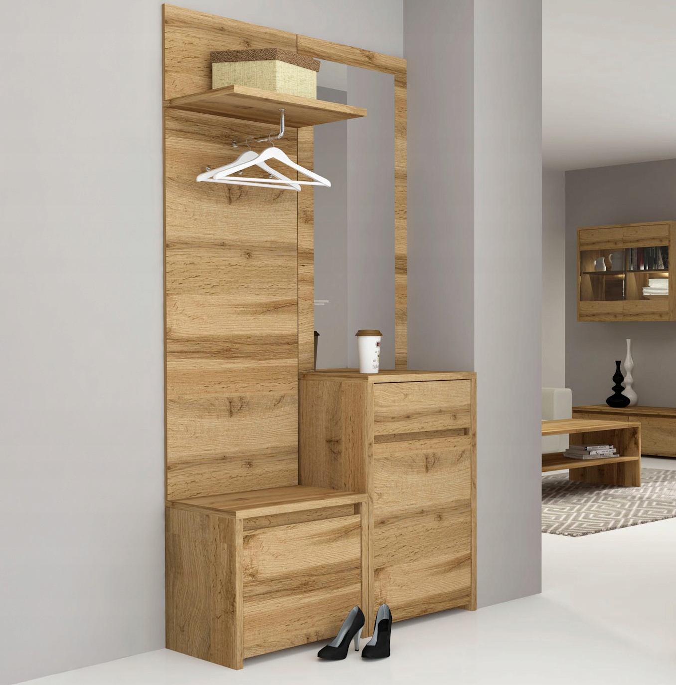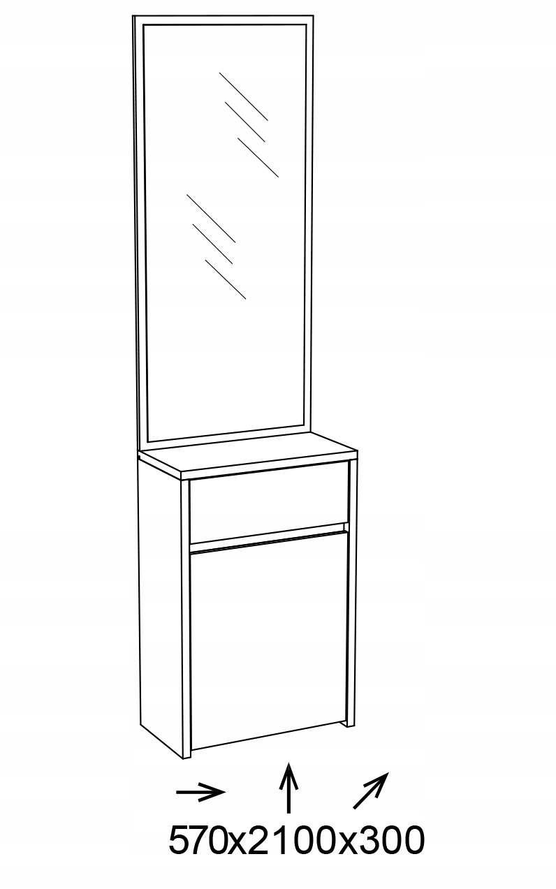 - Funkcjonalność w codziennym użytkowaniu – połączenie dużego lustra, praktycznej szuflady i pojemnego schowka umożliwia wygodne przechowywanie akcesoriów i szybkie poprawki wyglądu przed wyjściem z domu.