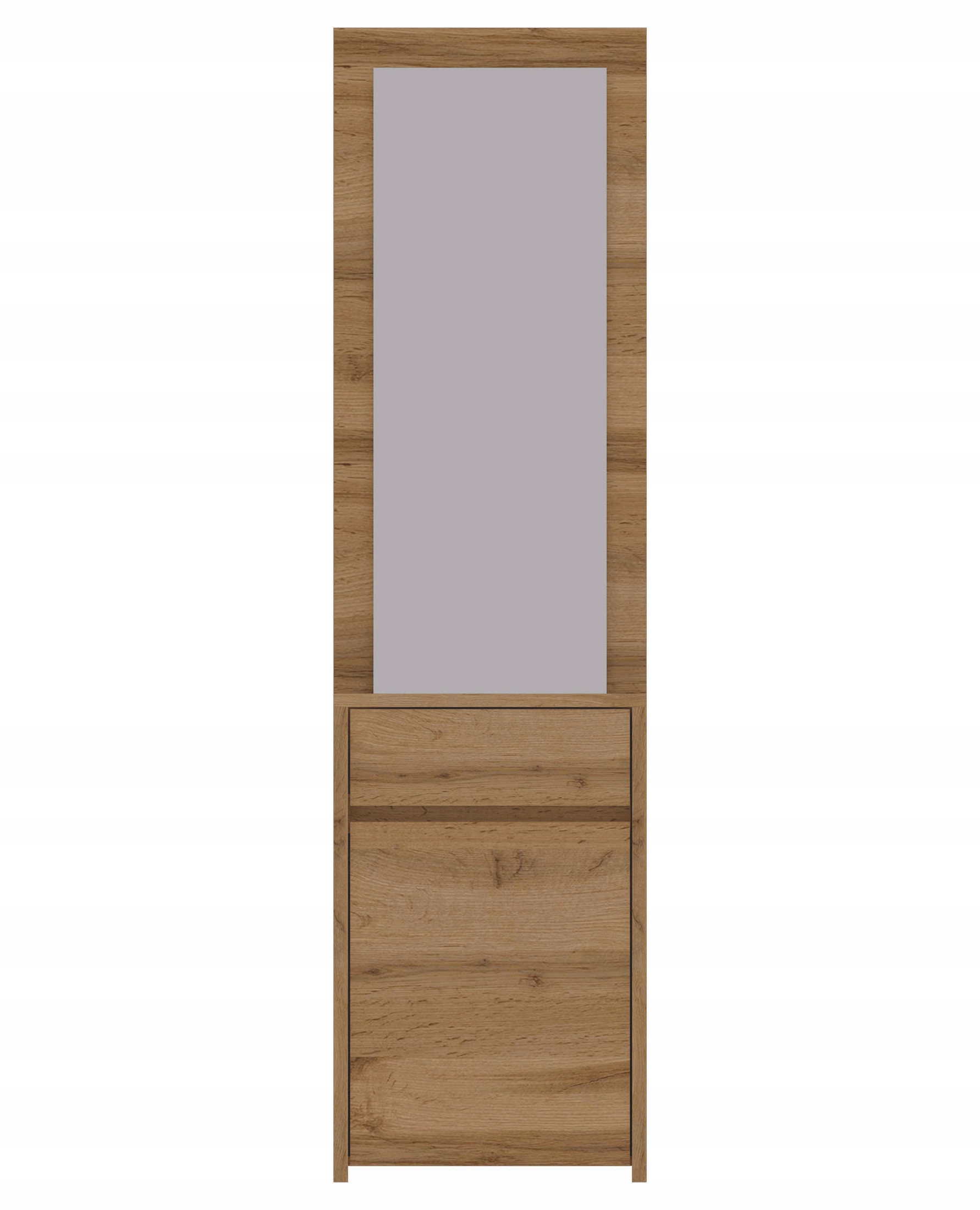 Nowoczesna szafka z lustrem TAHOE TA29 o wymiarach 57 × 210 × 30 cm to funkcjonalny mebel do przedpokoju, utrzymany w modnym dekorze dąb wotan. Zintegrowane lustro w dużym formacie wizualnie powiększa przestrzeń i nadaje wnętrzu elegancji, doskonale komponując się z ciepłym, naturalnym wybarwieniem drewna. Prosty, geometryczny kształt oraz subtelne frezowanie frontów sprawiają, że mebel świetnie odnajdzie się zarówno w aranżacjach skandynawskich, jak i nowoczesnych.