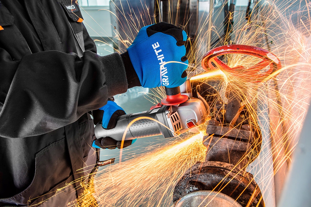 Wysokiej klasy szlifierka kątowa GRAPHITE (nr ref. 59G110) z silnikiem o mocy 1100W. Tarcza szlifierki o średnicy 125 mm. Urządzenie dzięki ergonomicznemu kształtowi oraz dokładnemu wyważeniu zapewnia wysoki komfort pracy. Istnieje możliwość dwupozycyjnego mocowania rękojeści bocznej. Szlifierka dla bezpieczeństwa została wyposażona w dwustopniowy włącznik z blokadą przypadkowego włączenia oraz zabezpieczony przed przypadkowym wciśnięciem przycisk blokady wrzeciona. Odpowiednie rozmieszczenie otworów wentylacyjnych zapewnia wydajne chłodzenie silnika. Maksymalna prędkość obrotowa głowicy wynosi 11000 obrotów na minutę. Urządzenie wyposażono w elastyczny i wytrzymały przewód zasilający w powłoce gumowej o długości 3m, dedykowany także do zastosowań profesjonalnych i przemysłowych zarówno wewnątrz jak i na zewnątrz pomieszczeń. Zgodność z europejskimi standardami zapewnia certyfikat CE.