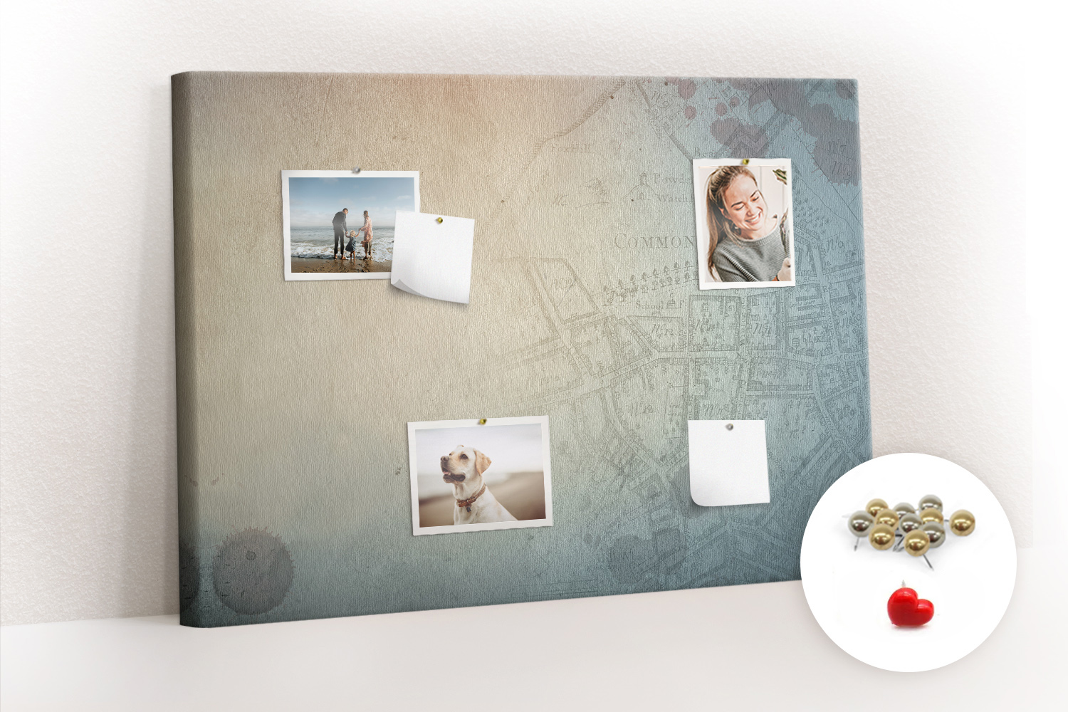Tablica korkowa z nadrukiem z metalicznymi pinezkami
