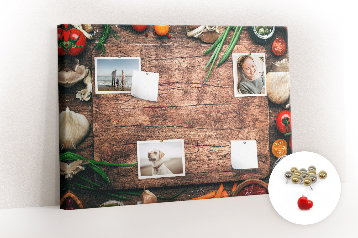 Tablica korkowa z nadrukiem z metalicznymi pinezkami