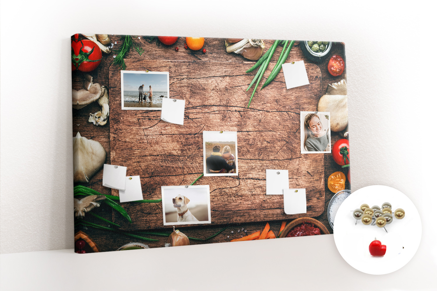 Tablica korkowa z nadrukiem z metalicznymi pinezkami