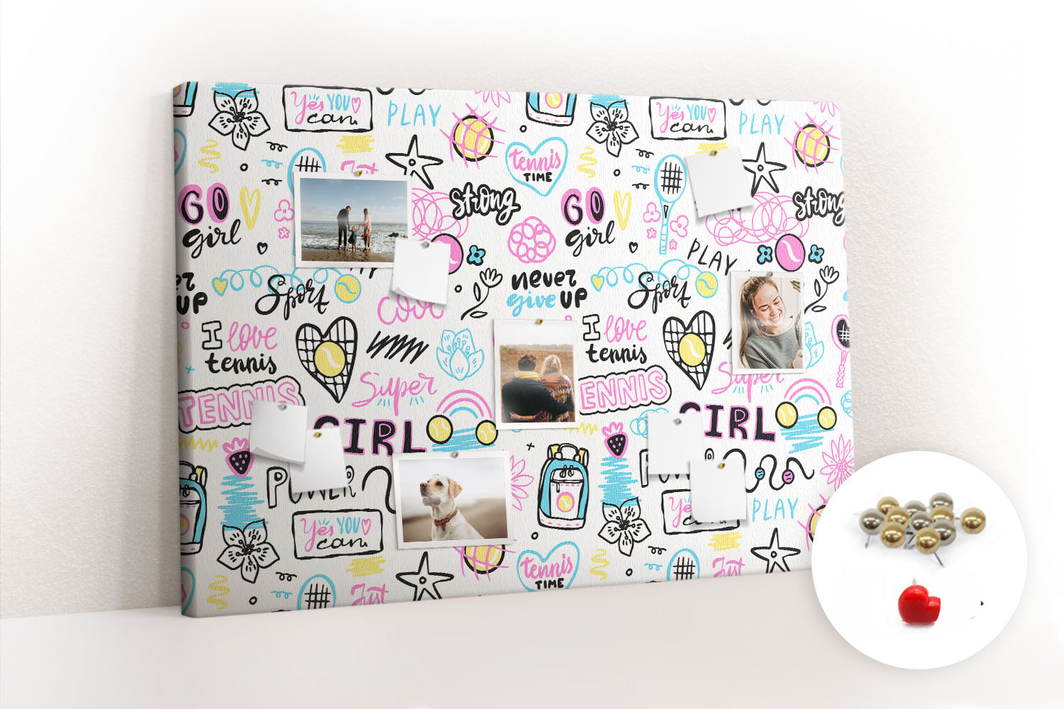 Tablica korkowa z nadrukiem z metalicznymi pinezkami