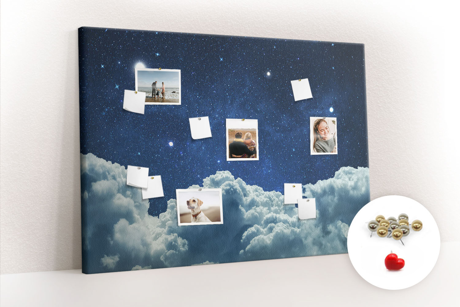 Tablica korkowa z nadrukiem z metalicznymi pinezkami