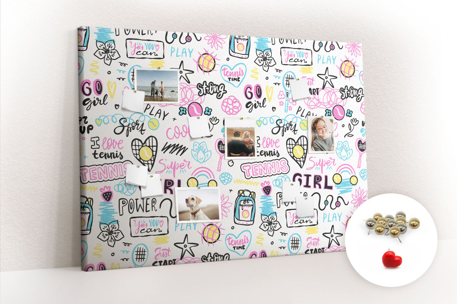 Tablica korkowa z nadrukiem z metalicznymi pinezkami