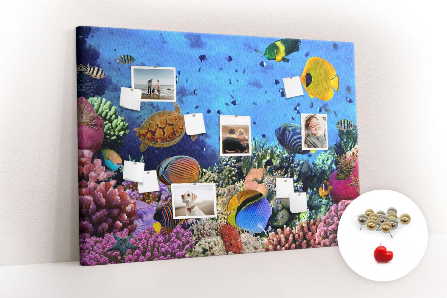 Tablica korkowa z nadrukiem z metalicznymi pinezkami