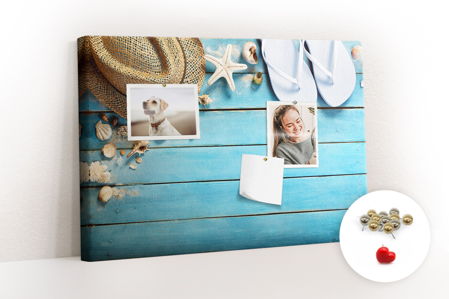 Tablica korkowa z nadrukiem z metalicznymi pinezkami