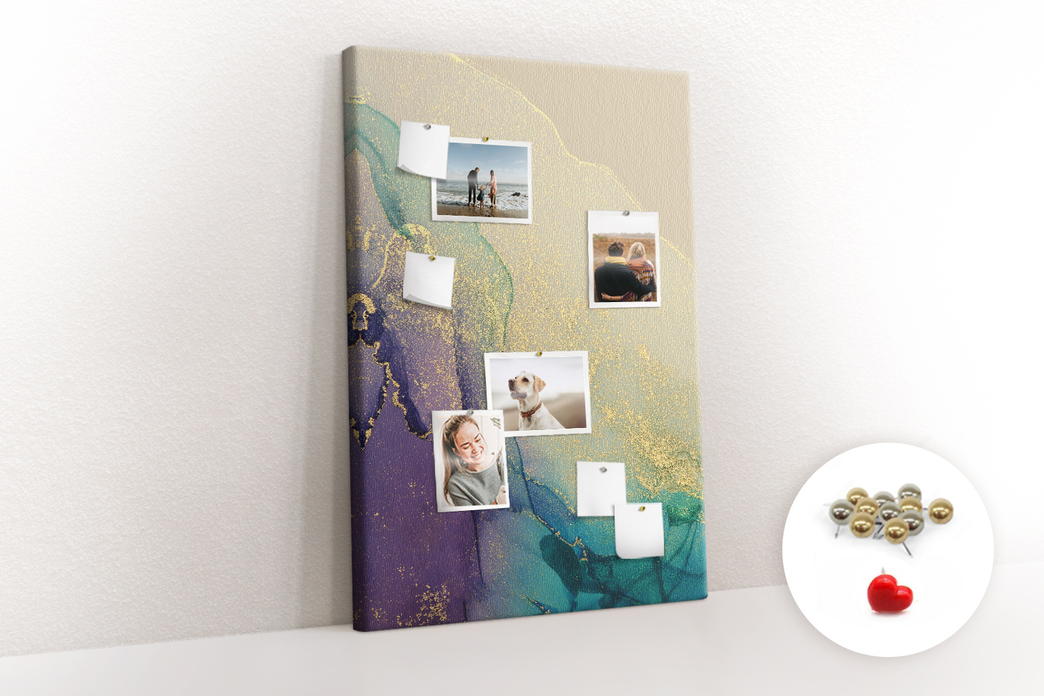 Tablica korkowa z nadrukiem z metalicznymi pinezkami