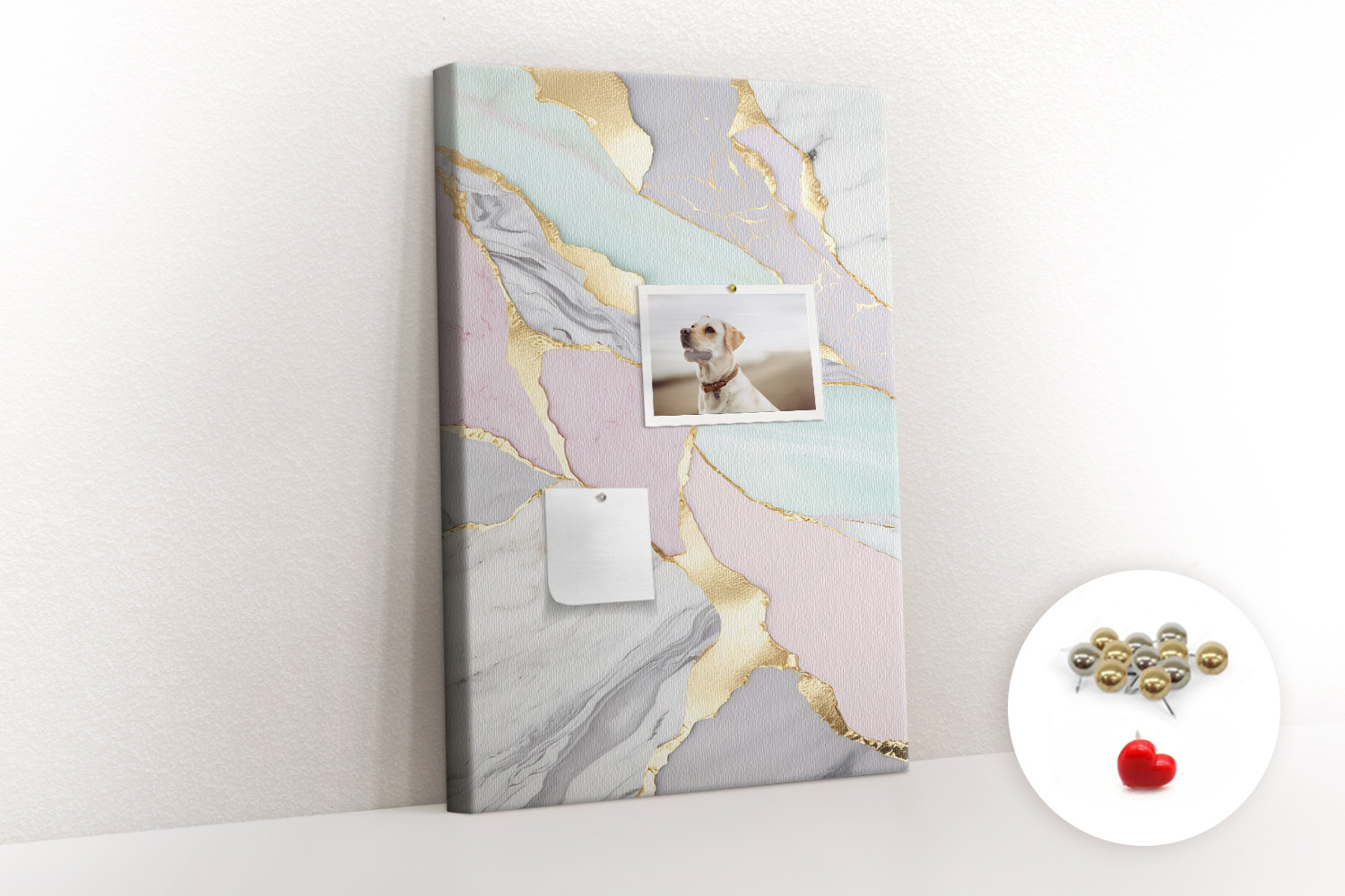 Tablica korkowa z nadrukiem z metalicznymi pinezkami