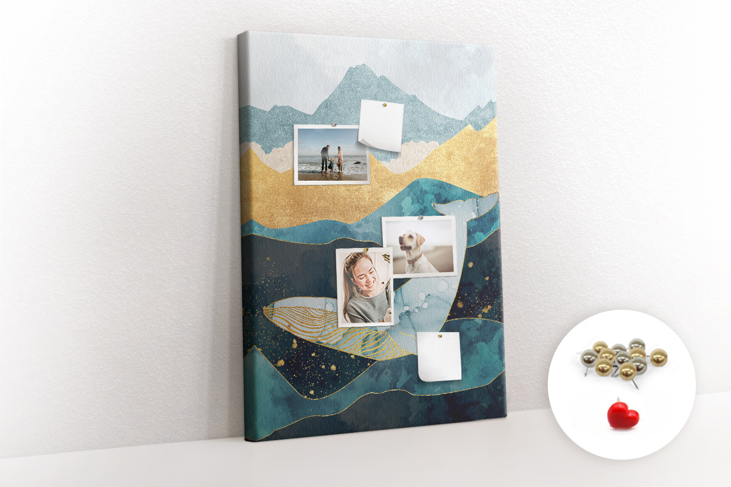 Tablica korkowa z nadrukiem z metalicznymi pinezkami