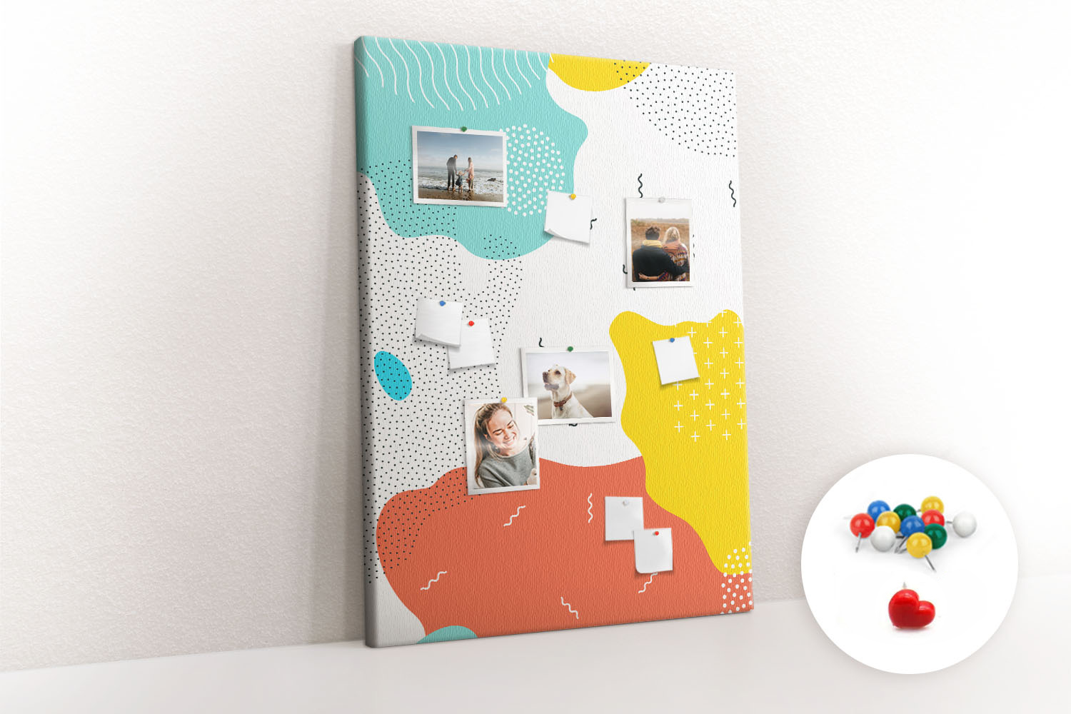 Tablica korkowa z nadrukiem z kolorowymi pinezkami