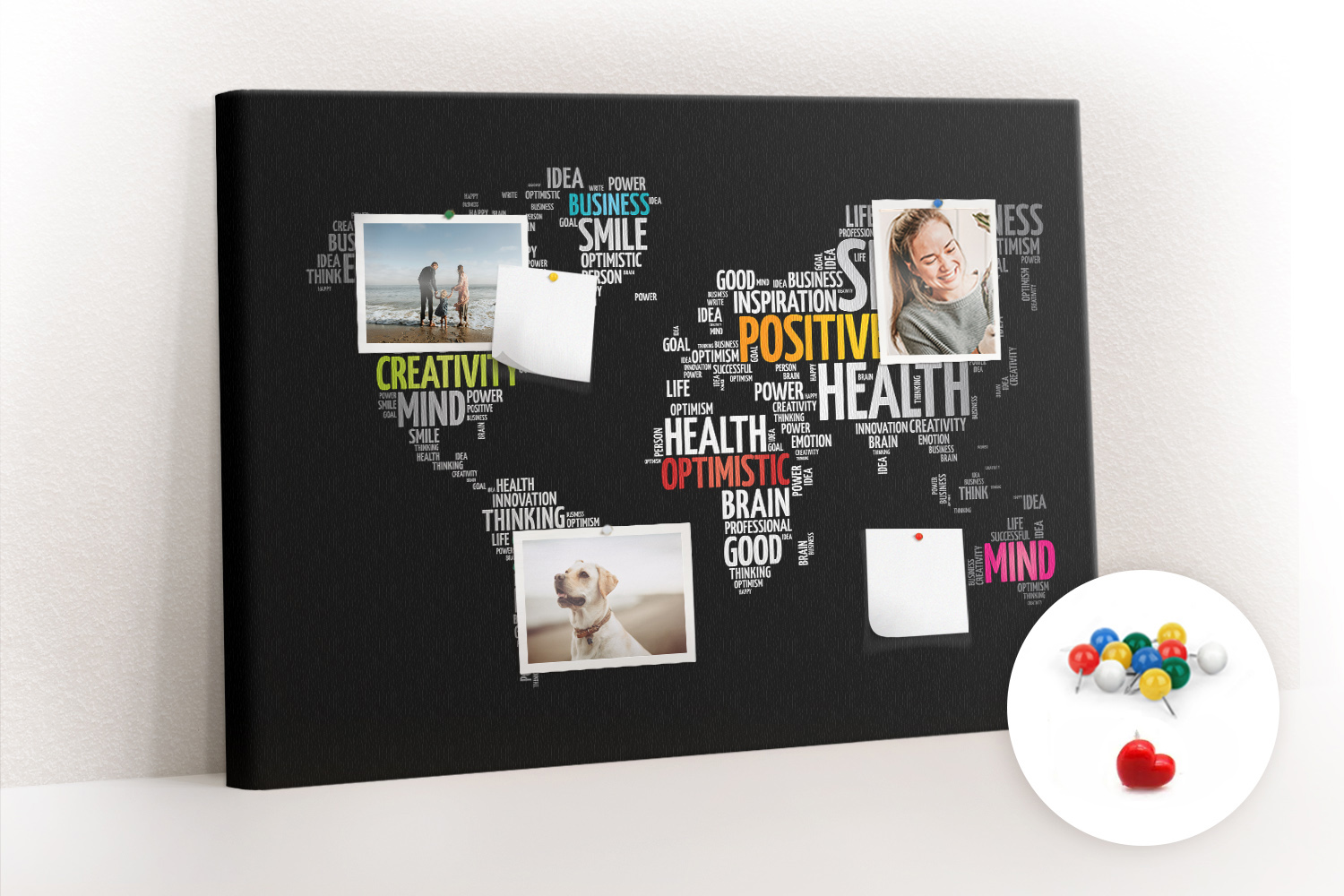 Tablica korkowa z nadrukiem z kolorowymi pinezkami