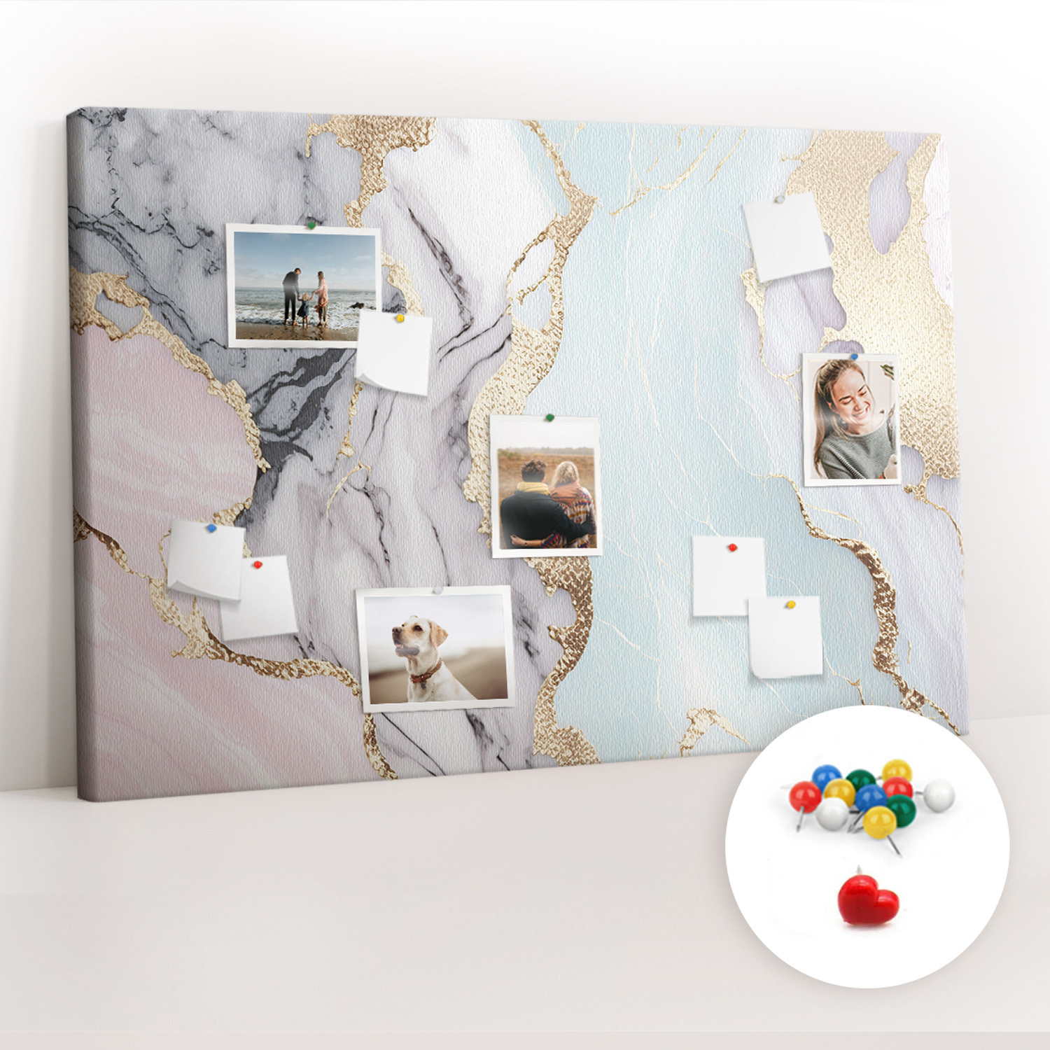 Tablica korkowa z nadrukiem z kolorowymi pinezkami