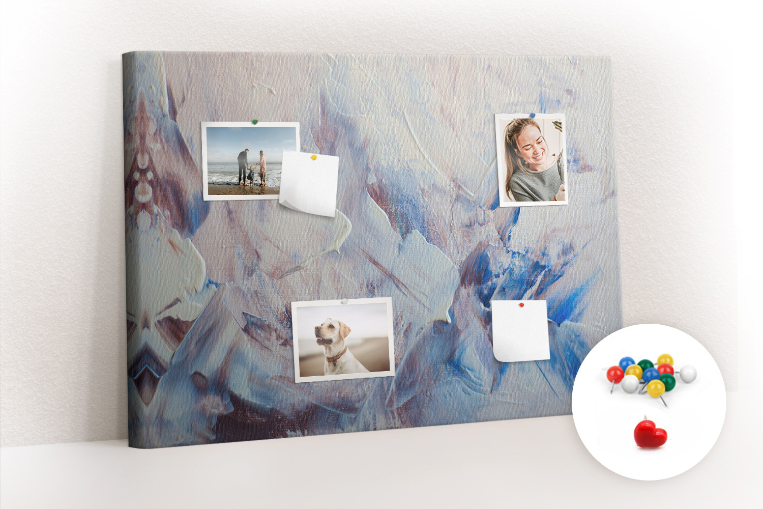 Tablica korkowa z nadrukiem z kolorowymi pinezkami