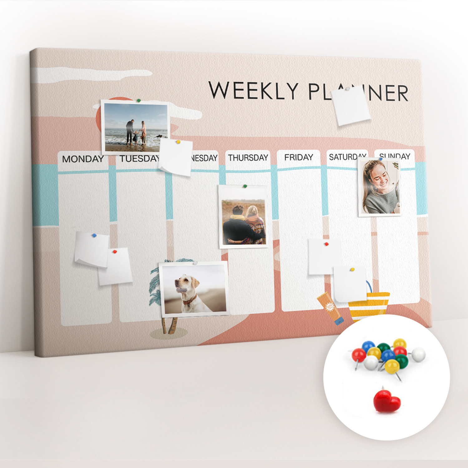 Tablica korkowa z nadrukiem z kolorowymi pinezkami