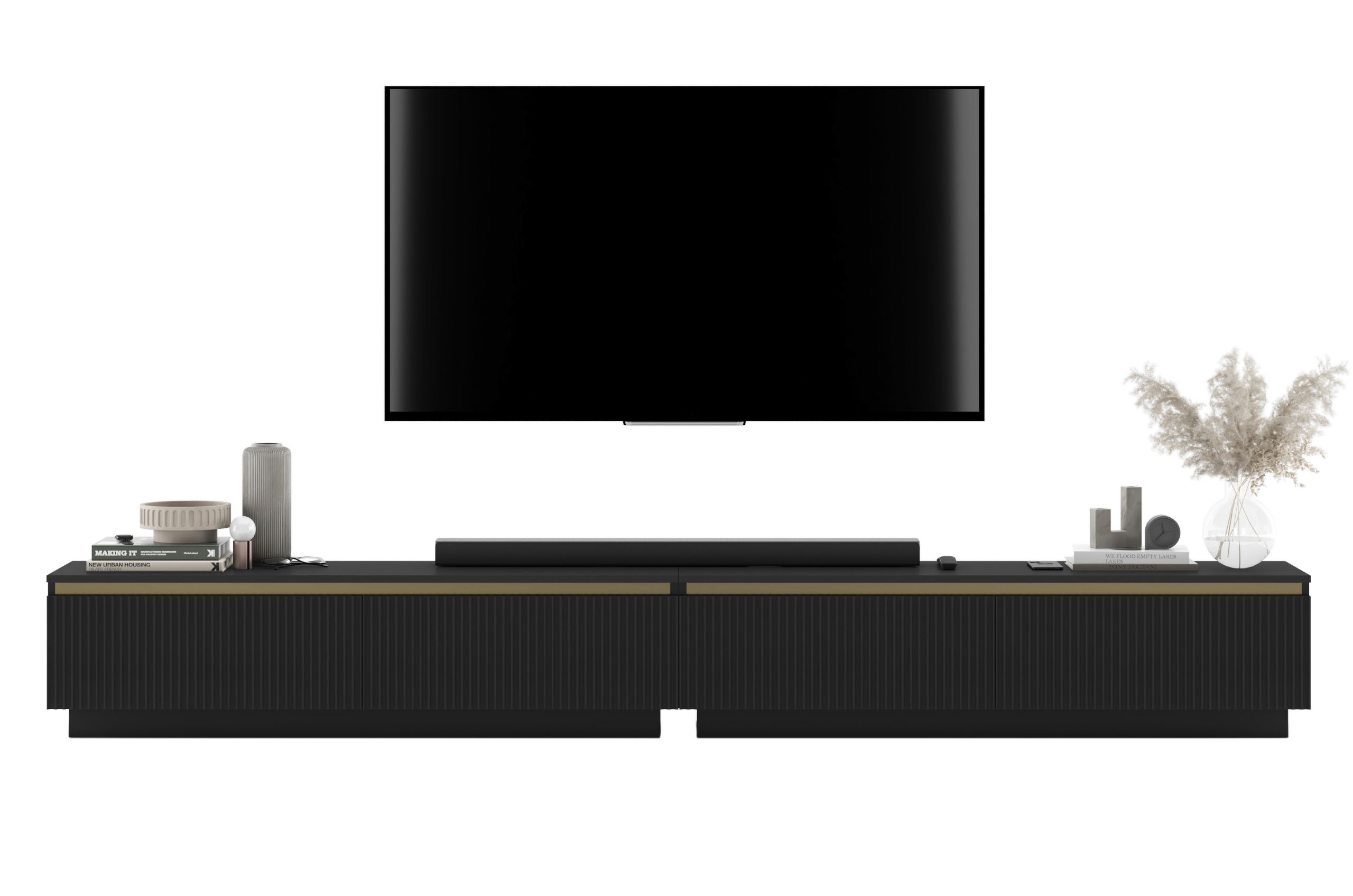 Zestaw dwóch nowoczesnych szafek RTV tworzących spójną i stylową całość. Razem oferują cztery przestronne, zamykane komory, zapewniając dużą pojemność oraz wysoką funkcjonalność. Szafki zostały ustawione obok siebie, tworząc długi, efektowny mebel, który doskonale prezentuje się w nowoczesnych wnętrzach. Dzięki uchylnym drzwiczkom z blokadą opadania zapewniają łatwy i bezpieczny dostęp do wnętrza. System „push to open” eliminuje potrzebę stosowania uchwytów, podkreślając estetyczny i minimalistyczny charakter mebla. Charakterystyczne ryflowane fronty w połączeniu ze złotymi akcentami wyróżniają ten zestaw na tle innych szafek RTV, nadając mu luksusowego i nowoczesnego wyglądu. SELENE to idealny wybór dla osób ceniących elegancję, funkcjonalność oraz nowoczesne rozwiązania w aranżacji wnętrz.Produkt może zostać zamontowany w wrsji wiszącej lub stojącej na drewnianym cokole.Pozwala to na dostosowanie się do indywidualnych potrzeb użytkownika.