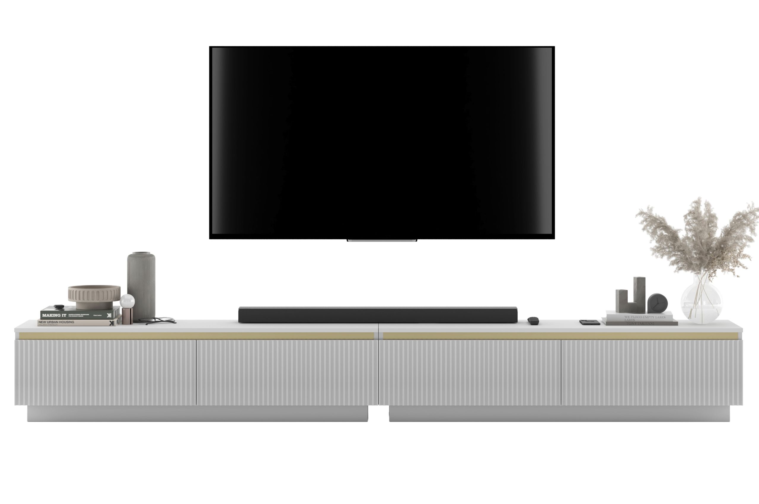 Zestaw dwóch nowoczesnych szafek RTV tworzących spójną i stylową całość. Razem oferują cztery przestronne, zamykane komory, zapewniając dużą pojemność oraz wysoką funkcjonalność. Szafki zostały ustawione obok siebie, tworząc długi, efektowny mebel, który doskonale prezentuje się w nowoczesnych wnętrzach. Dzięki uchylnym drzwiczkom z blokadą opadania zapewniają łatwy i bezpieczny dostęp do wnętrza. System „push to open” eliminuje potrzebę stosowania uchwytów, podkreślając estetyczny i minimalistyczny charakter mebla. Charakterystyczne ryflowane fronty w połączeniu ze złotymi akcentami wyróżniają ten zestaw na tle innych szafek RTV, nadając mu luksusowego i nowoczesnego wyglądu. SELENE to idealny wybór dla osób ceniących elegancję, funkcjonalność oraz nowoczesne rozwiązania w aranżacji wnętrz.Produkt może zostać zamontowany w wrsji wiszącej lub stojącej na drewnianym cokole.Pozwala to na dostosowanie się do indywidualnych potrzeb użytkownika.