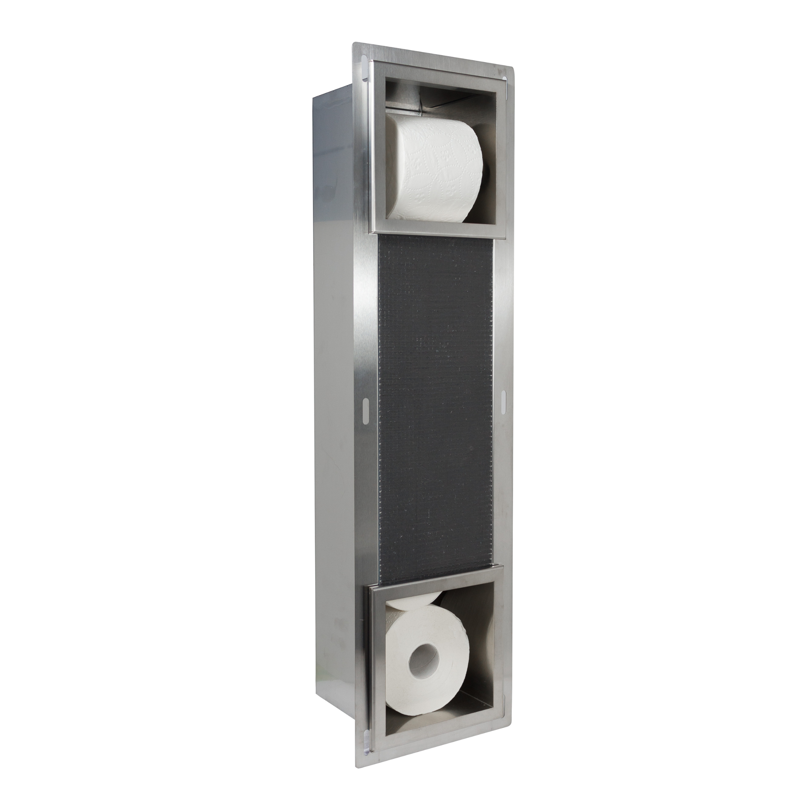 WALL-BOX PAPER 2 to podręczne uchwyty na papier toaletowy wraz z ukrytym w ścianie schowkiem na jego zapas. Połączenie tych dwóch funkcji pozwala na bieżące uzupełnianie papieru na podajniku. Zapasy papieru toaletowego najczęściej przechowywane są w szafkach łazienkowych, ale także w kuchni czy przedpokoju. Tymczasem nowa rolka powinna być zawsze w zasięgu ręki.