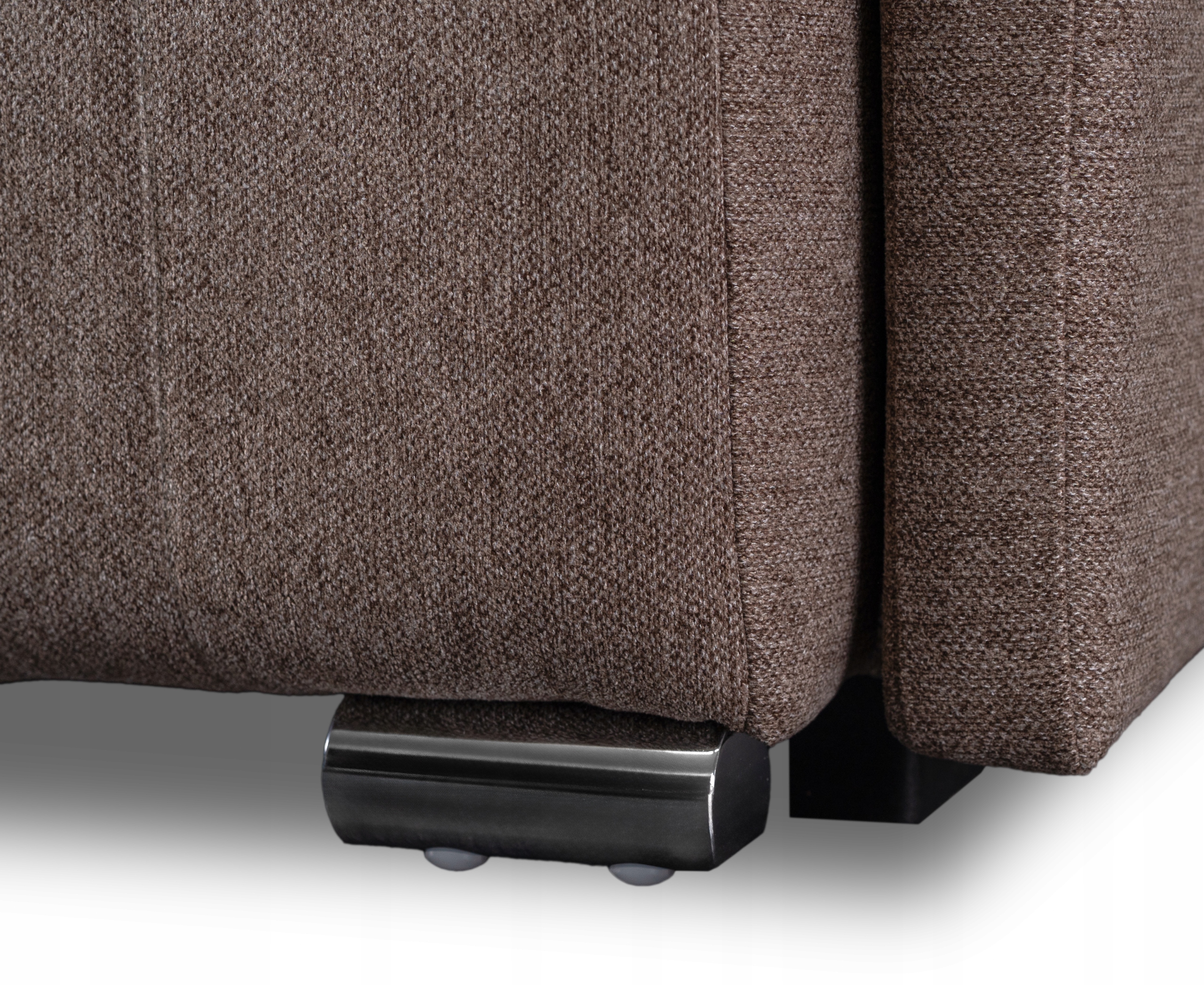 Chromowane nóżki kanapy w modnym kształcie to stylowy element, który dodaje jej nowoczesnego charakteru. Zapewniają stabilność i trwałość jednocześnie nadając meblowi lekkiego, eleganckiego wyglądu.