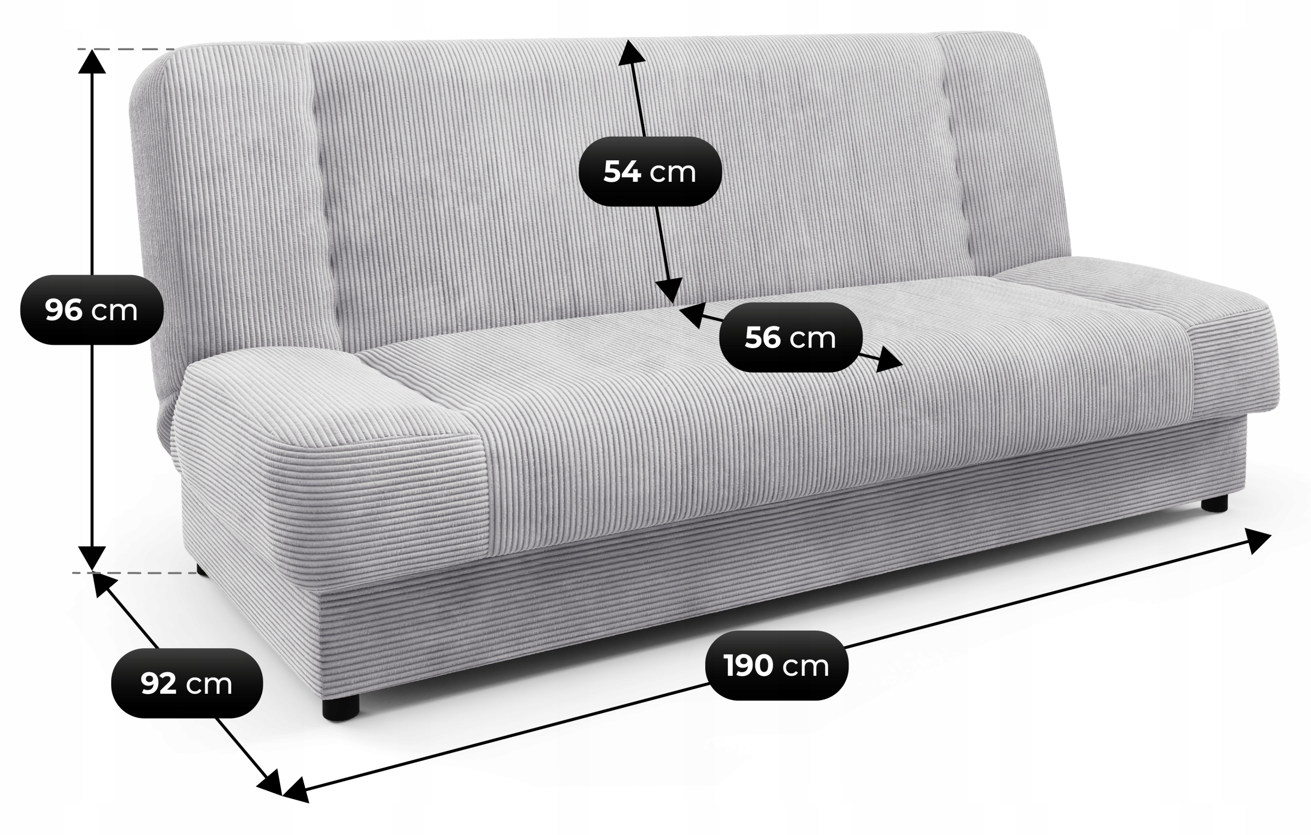 - Rozkładana funkcja spania – powierzchnia po rozłożeniu: 190 × 117 cm, umożliwia komfortowy sen dla dwóch osób.