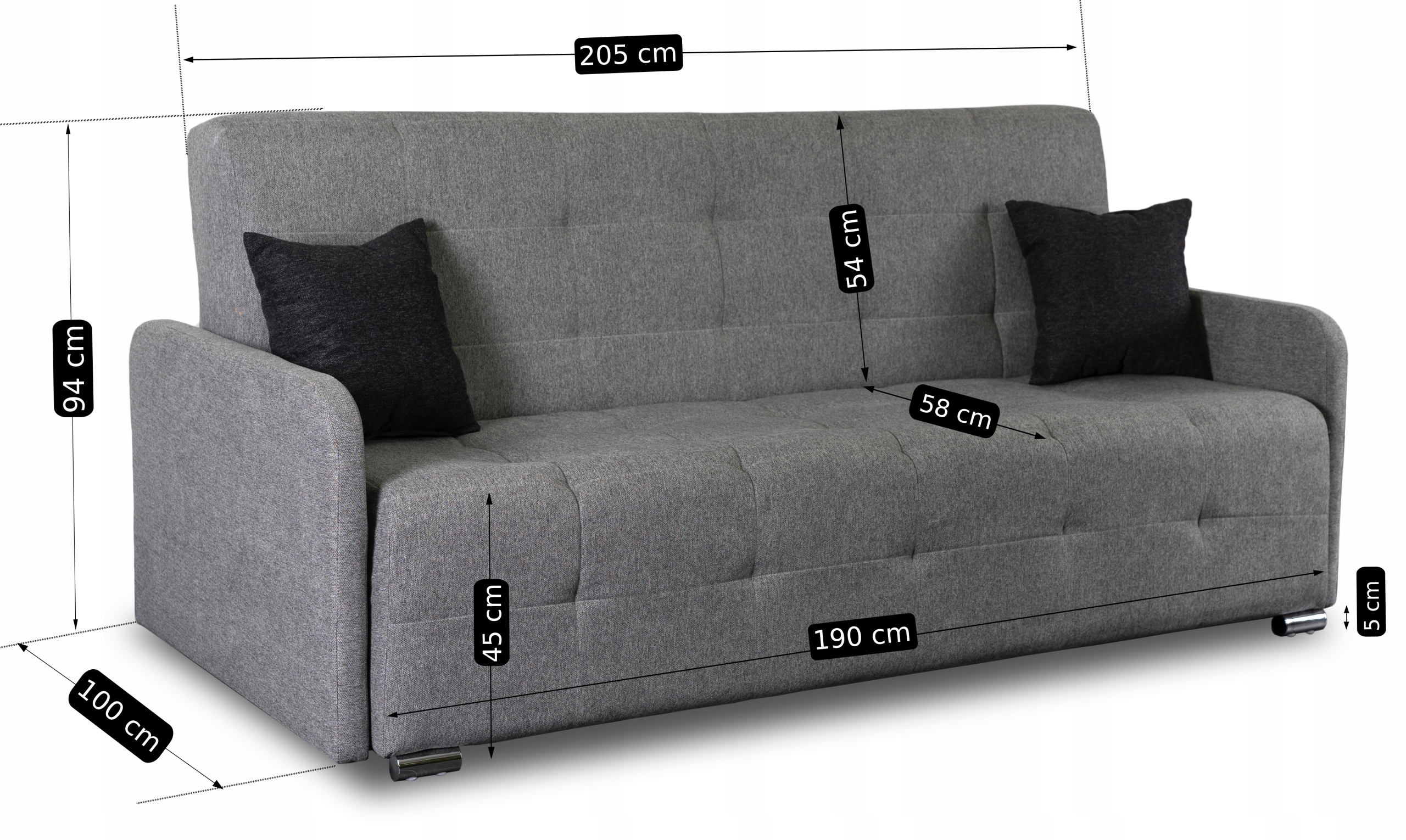 Jedną z głównych zalet kanapy jest funkcja spania, która pozwala na szybkie przekształcenie jej w przestronne łóżko o wymiarach 195x126 cm.