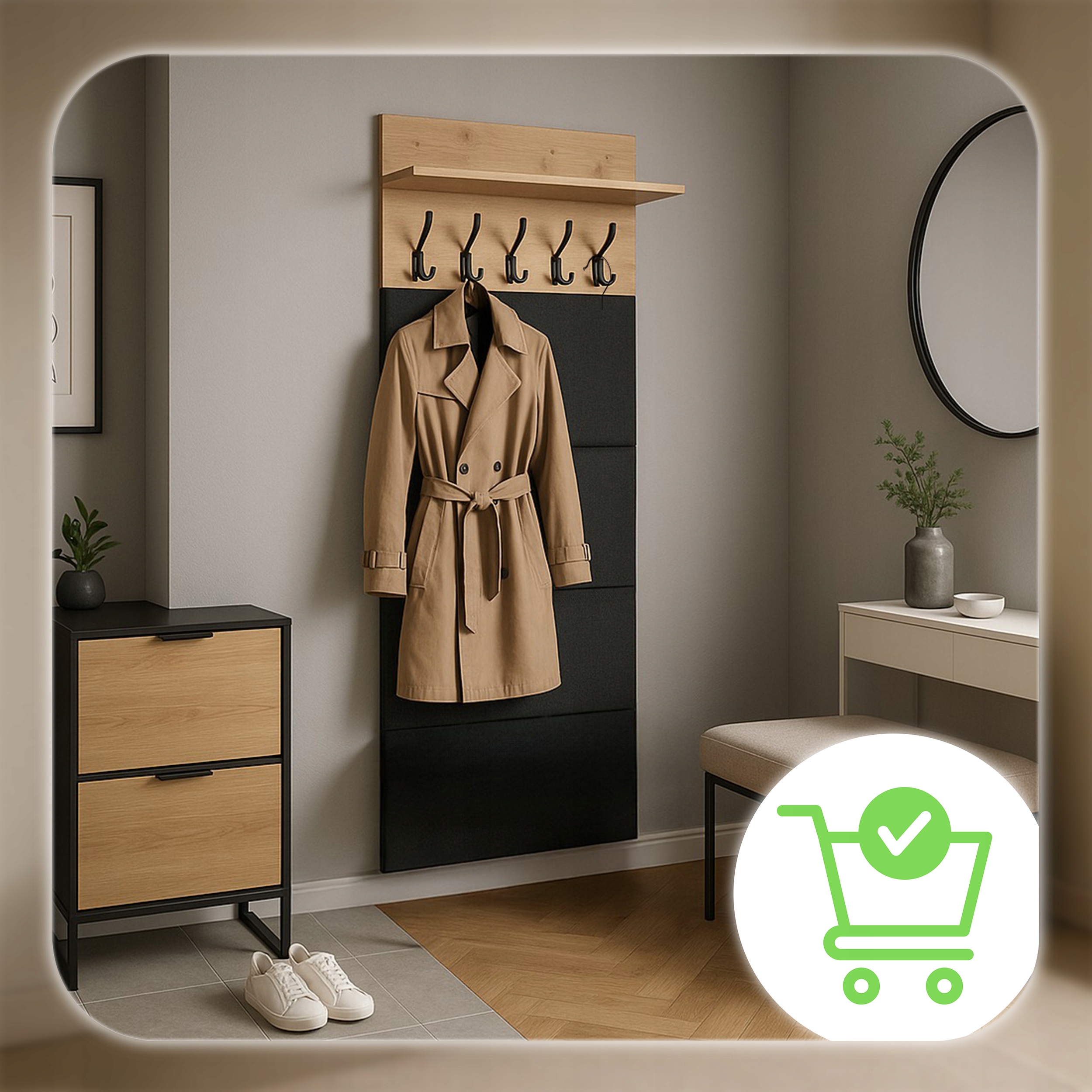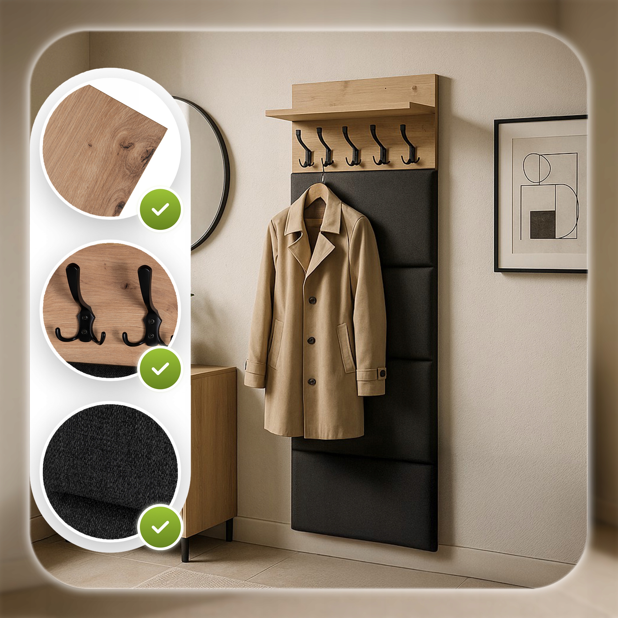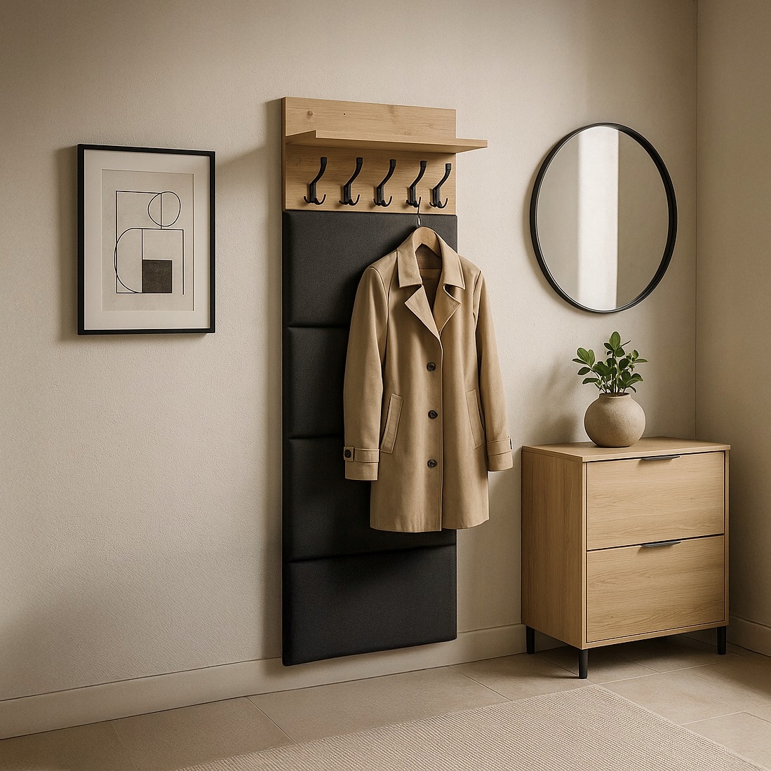 Ten panel ścienny to idealne rozwiązanie do przedpokoju, garderoby czy korytarza. Ułatwia organizację, pozwala utrzymać porządek i nadaje wnętrzu elegancki, przytulny wygląd.