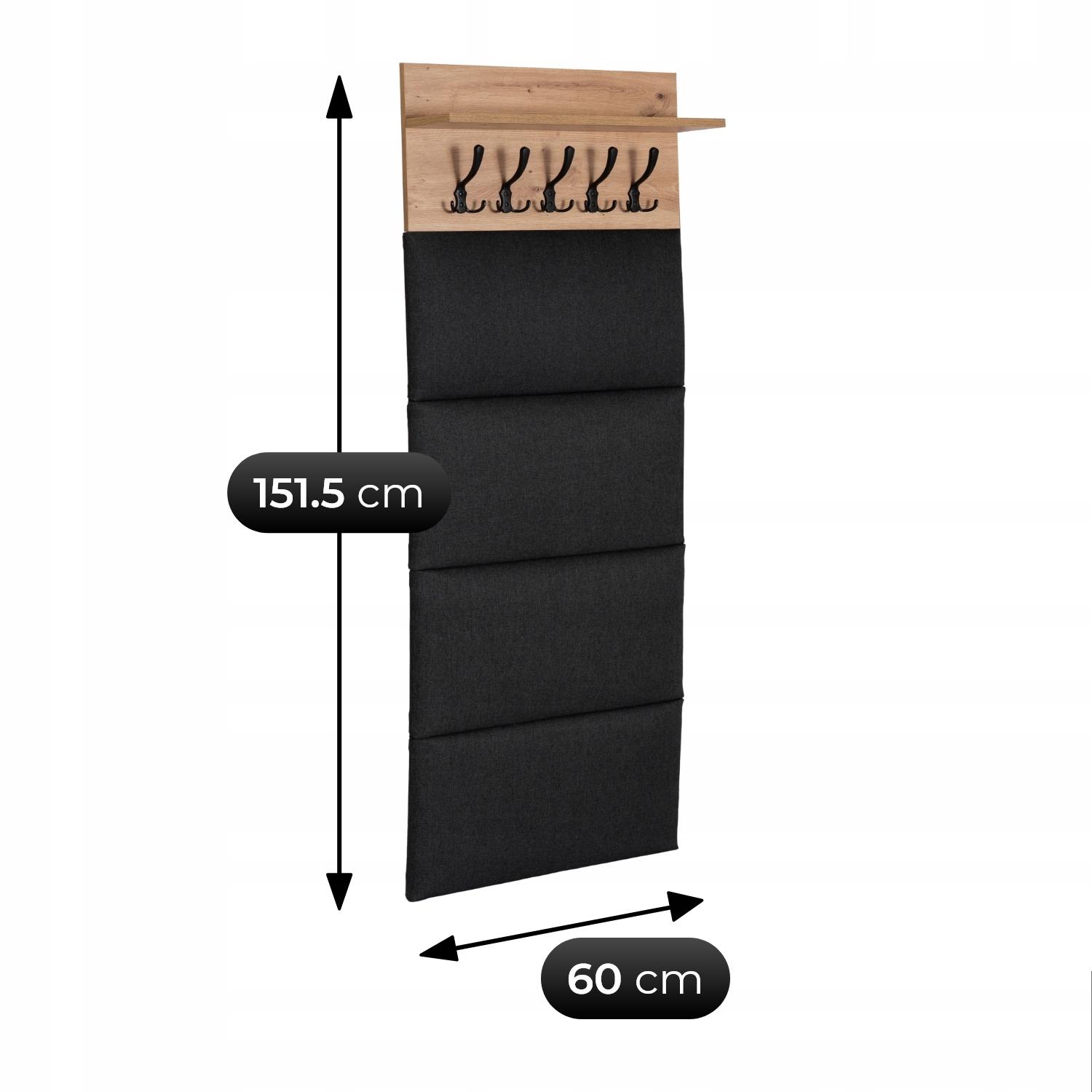 Praktyczny i nowoczesny panel ścienny MODENA w kolorze dębu to doskonałe rozwiązanie do przedpokoju. Dzięki połączeniu tapicerowanych paneli w kolorze czarnym oraz solidnych haczyków zyskujesz funkcjonalność i estetykę w jednym.