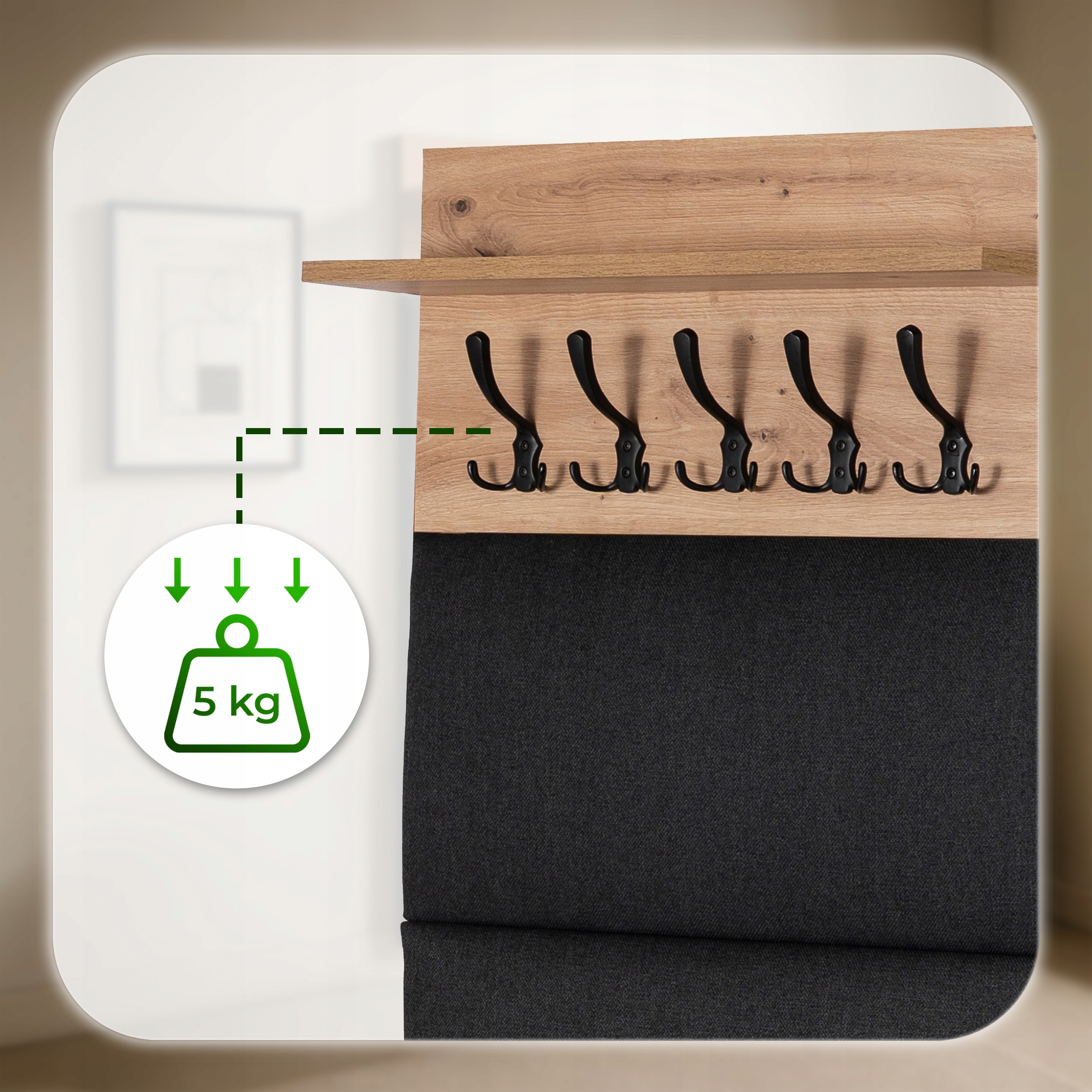 - Solidna konstrukcja – każdy haczyk wytrzymuje obciążenie do 5 kg.