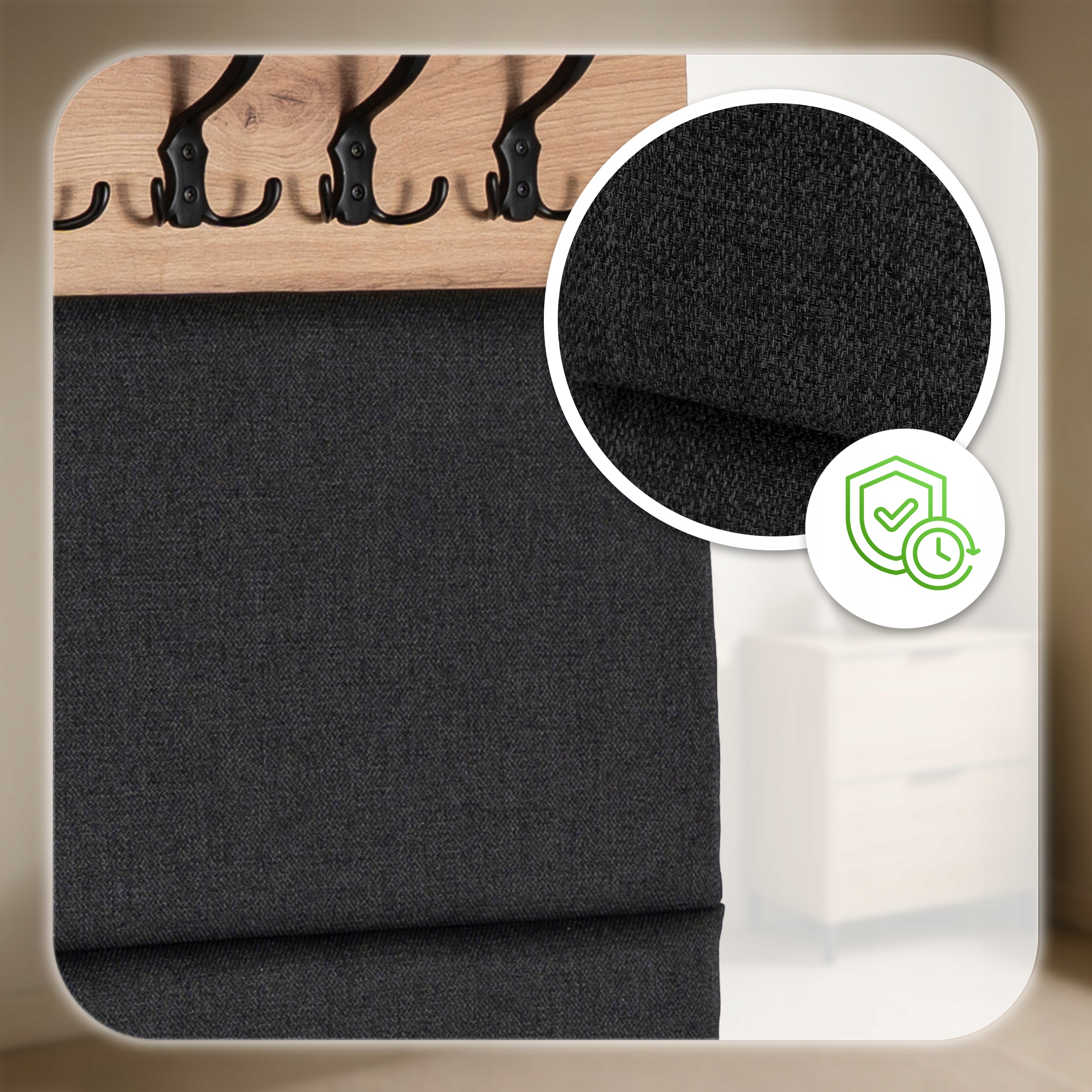 - Tapicerowany panel w kolorze czarnym – chroni ścianę, dodaje elegancji i wygodnie amortyzuje ubrania.