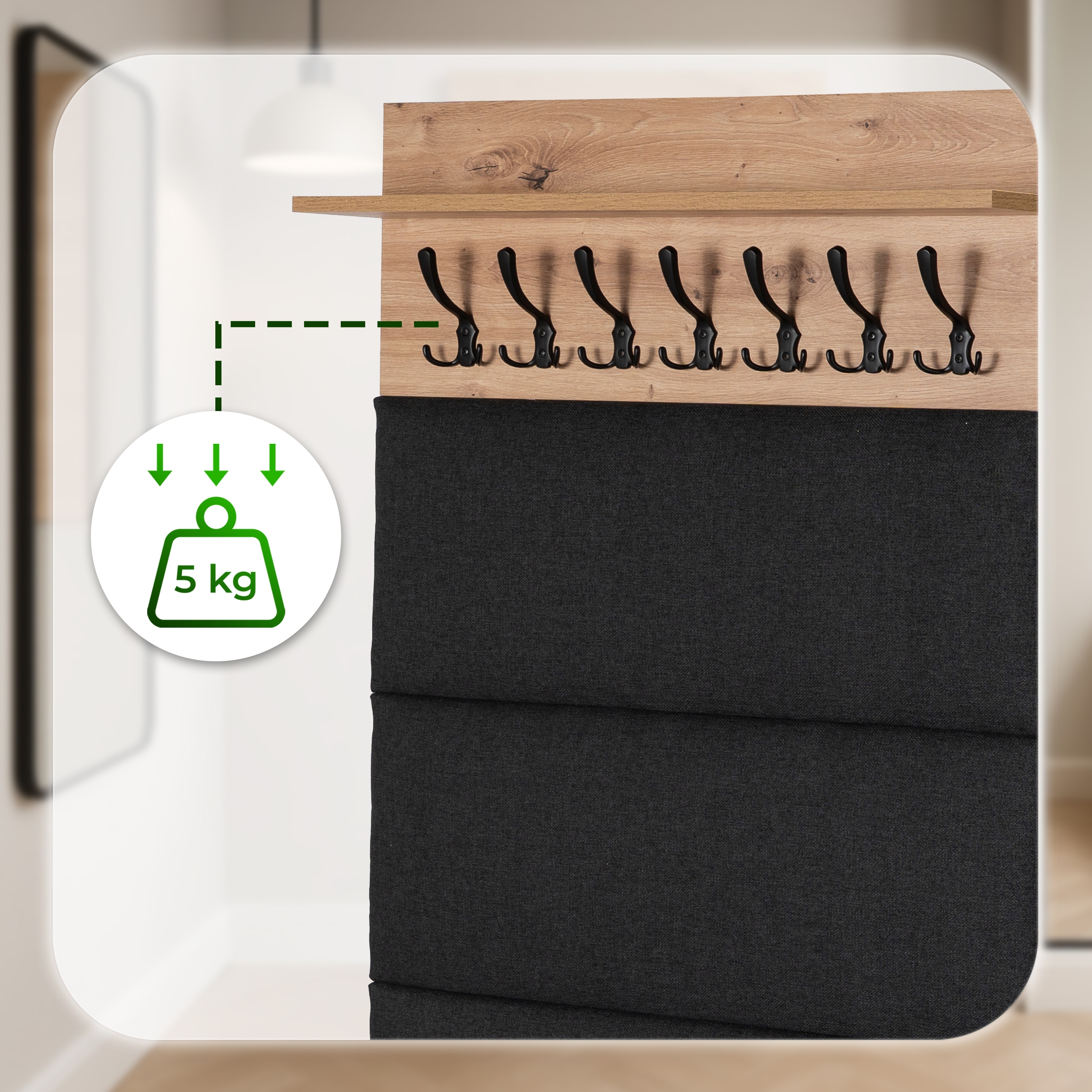 Praktyczny i nowoczesny panel ścienny PRATO w kolorze dębu to doskonałe rozwiązanie do przedpokoju. Dzięki połączeniu tapicerowanych paneli w kolorze czarnym oraz solidnych haczyków zyskujesz funkcjonalność i estetykę w jednym.