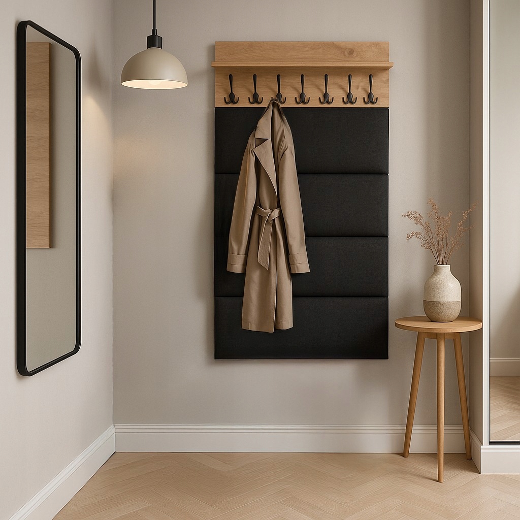 Ten panel ścienny to idealne rozwiązanie do przedpokoju, garderoby czy korytarza. Ułatwia organizację, pozwala utrzymać porządek i nadaje wnętrzu elegancki, przytulny wygląd.