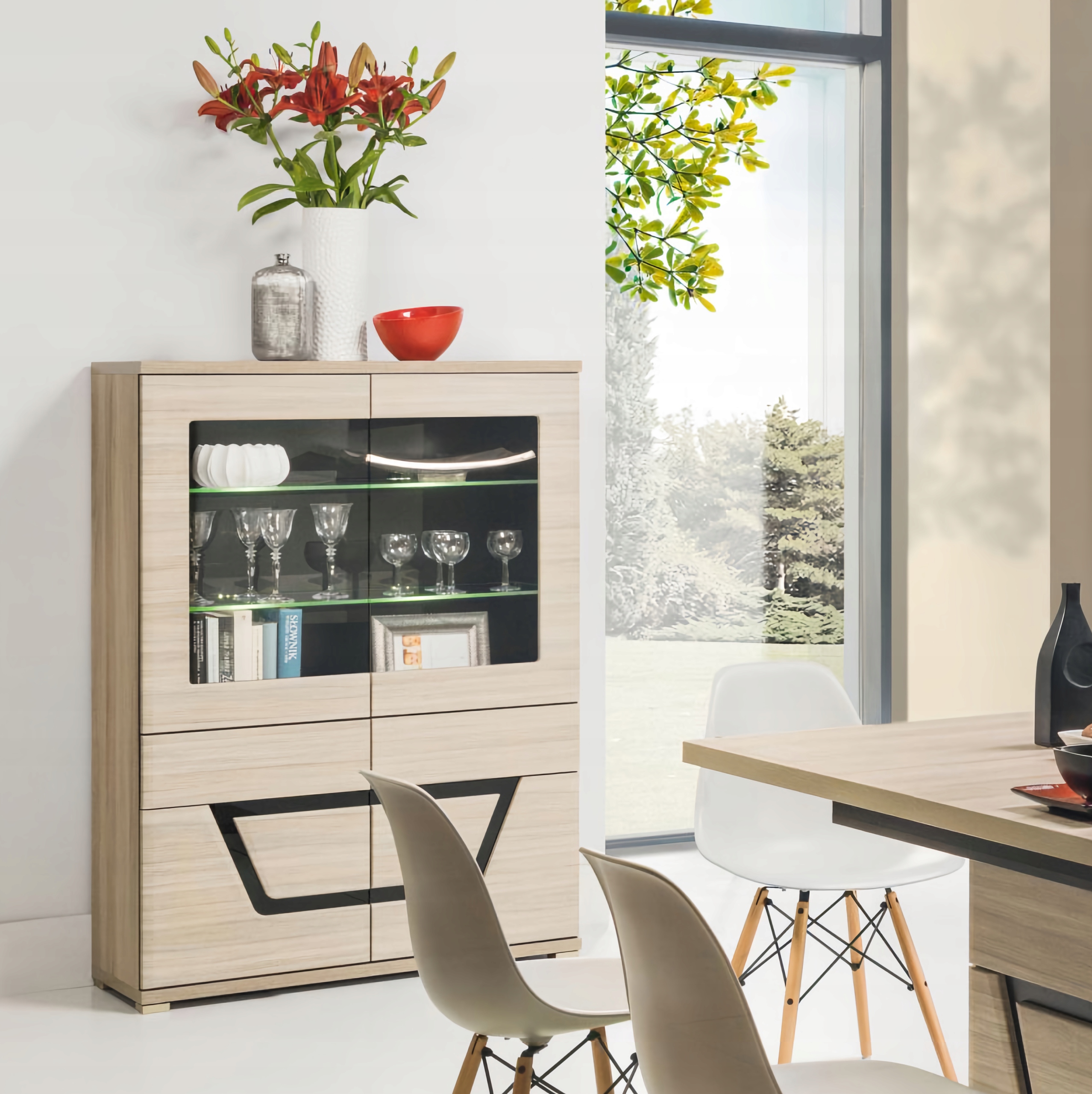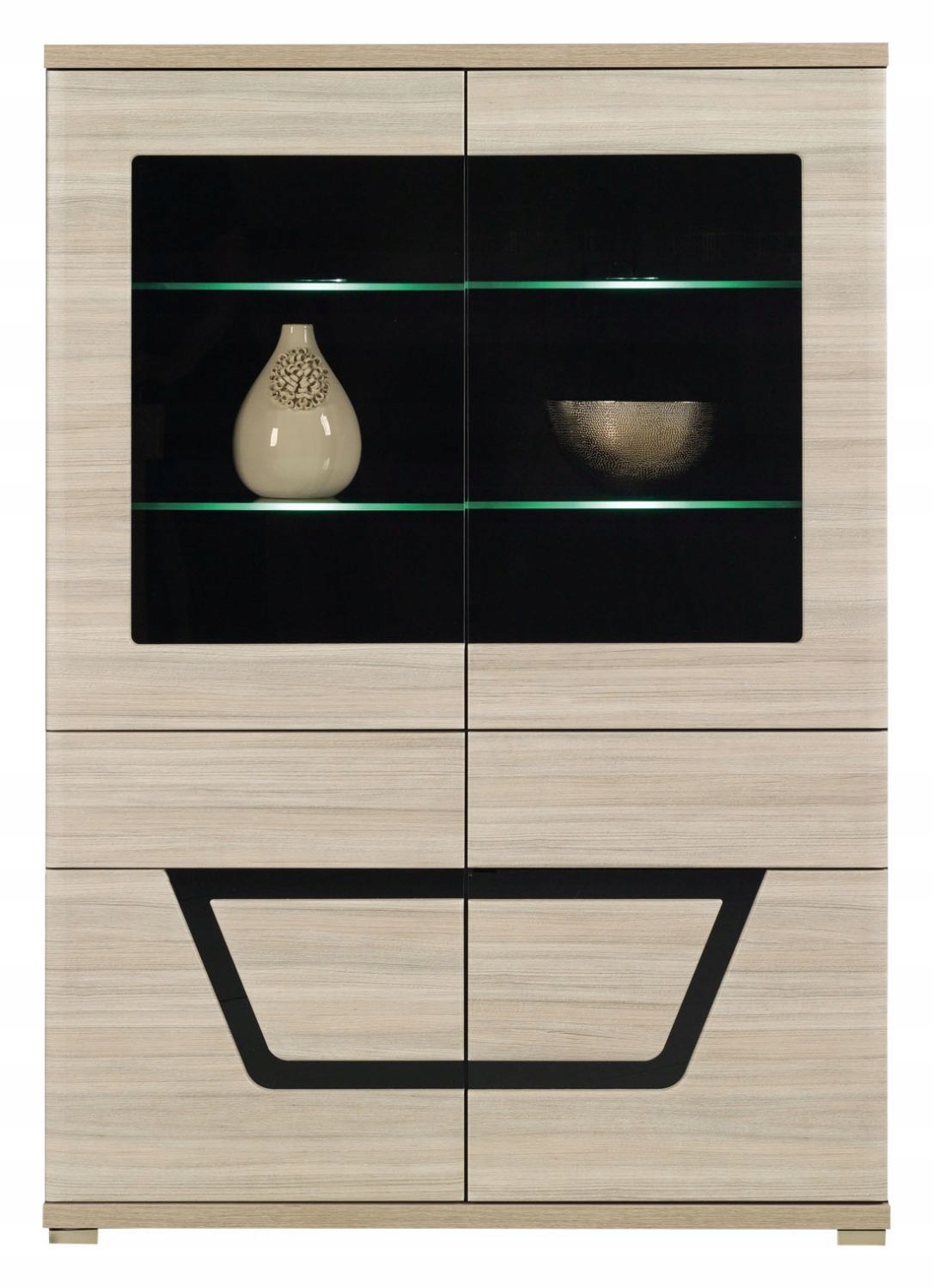- Przestronna i efektowna forma ekspozycyjna – witryna wyposażona w przeszklone górne drzwiczki z oświetleniem LED umożliwia eleganckie wyeksponowanie dekoracji, pamiątek lub porcelany, a dolne zamykane szafki oraz dwie szuflady zapewniają praktyczne miejsce na przedmioty codziennego użytku.