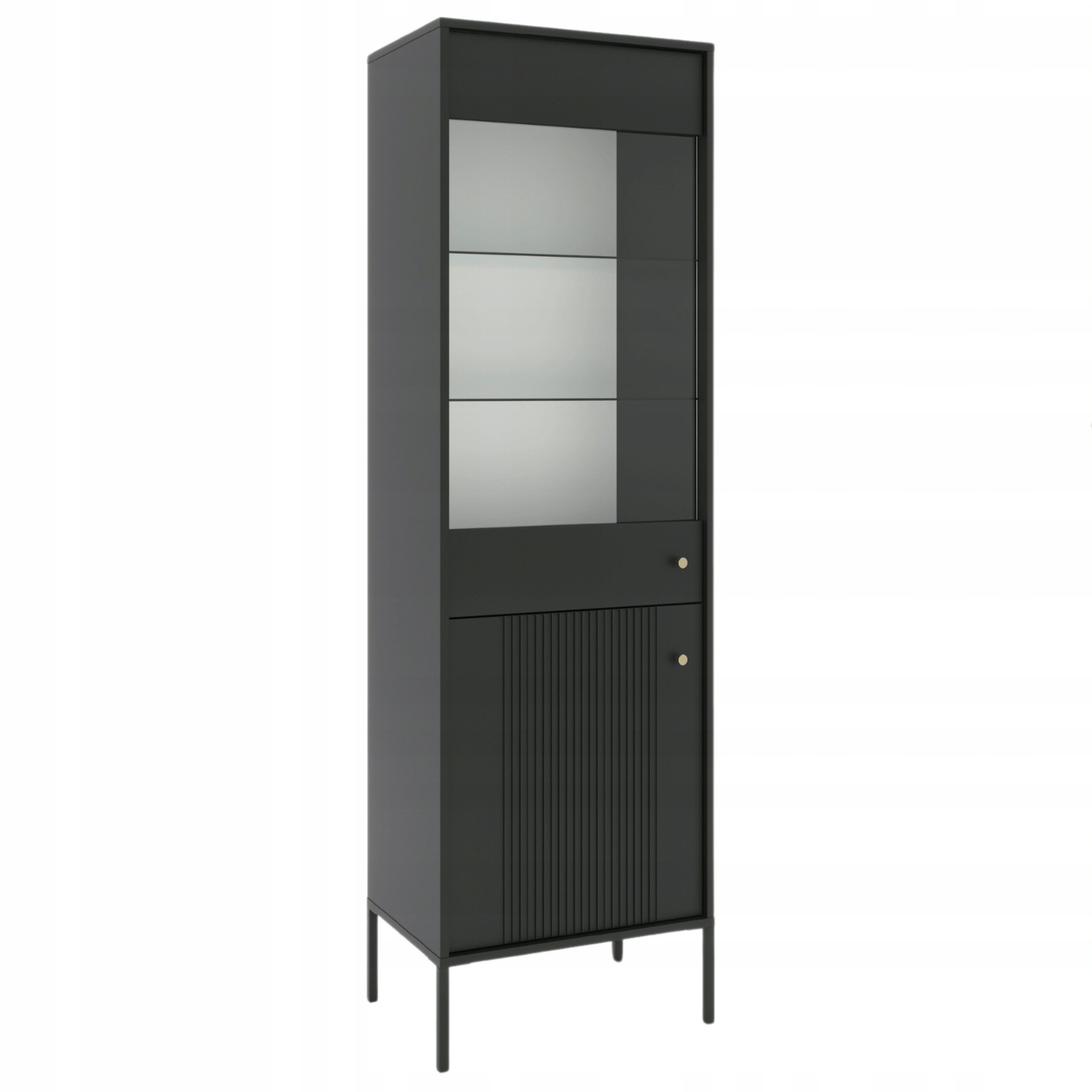 Smukła i elegancka witryna ze szklanymi półkami. Jej design podkreślają ryflowane drzwiczki oraz funkcjonalne półki, które zapewniają dużą przestrzeń do przechowywania. Czarny kolor w połączeniu ze złotymi uchwytami dodaje jej elegancji.