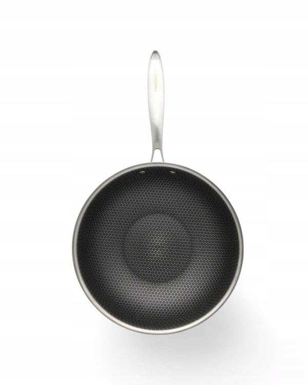 - Wnętrze woka pokryte jest strukturą plastra miodu, co zapewnia równomierne rozprowadzanie tłuszczu i zmniejsza ryzyko przywierania potraw.