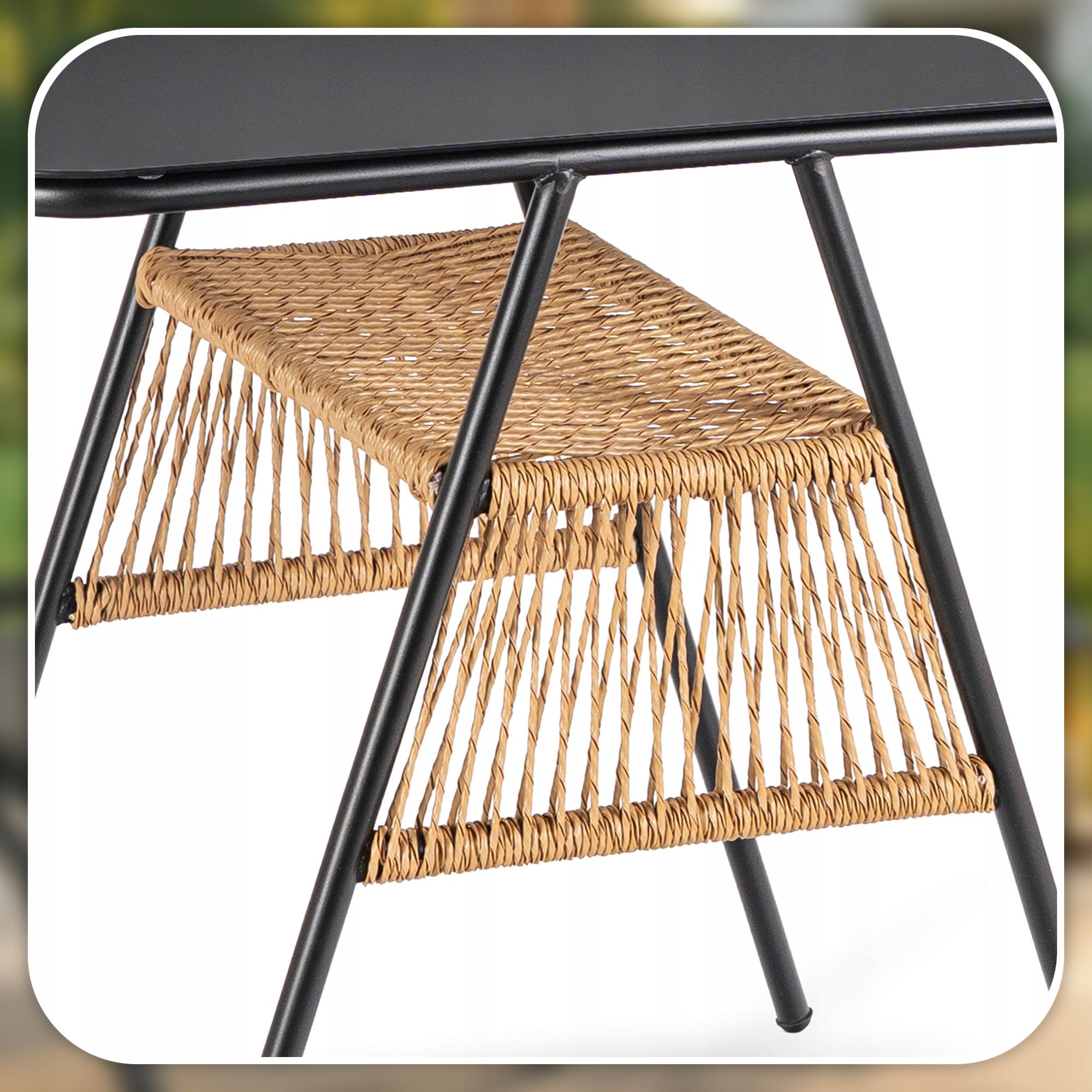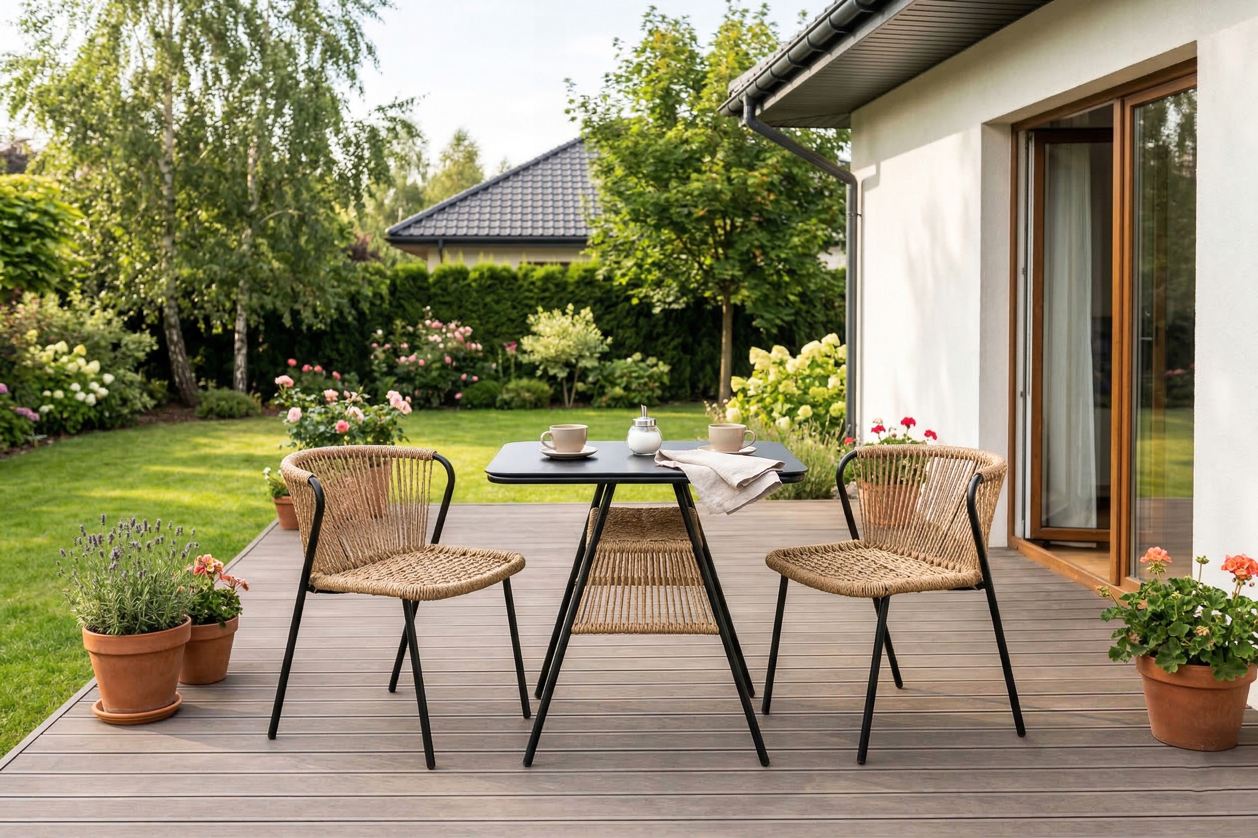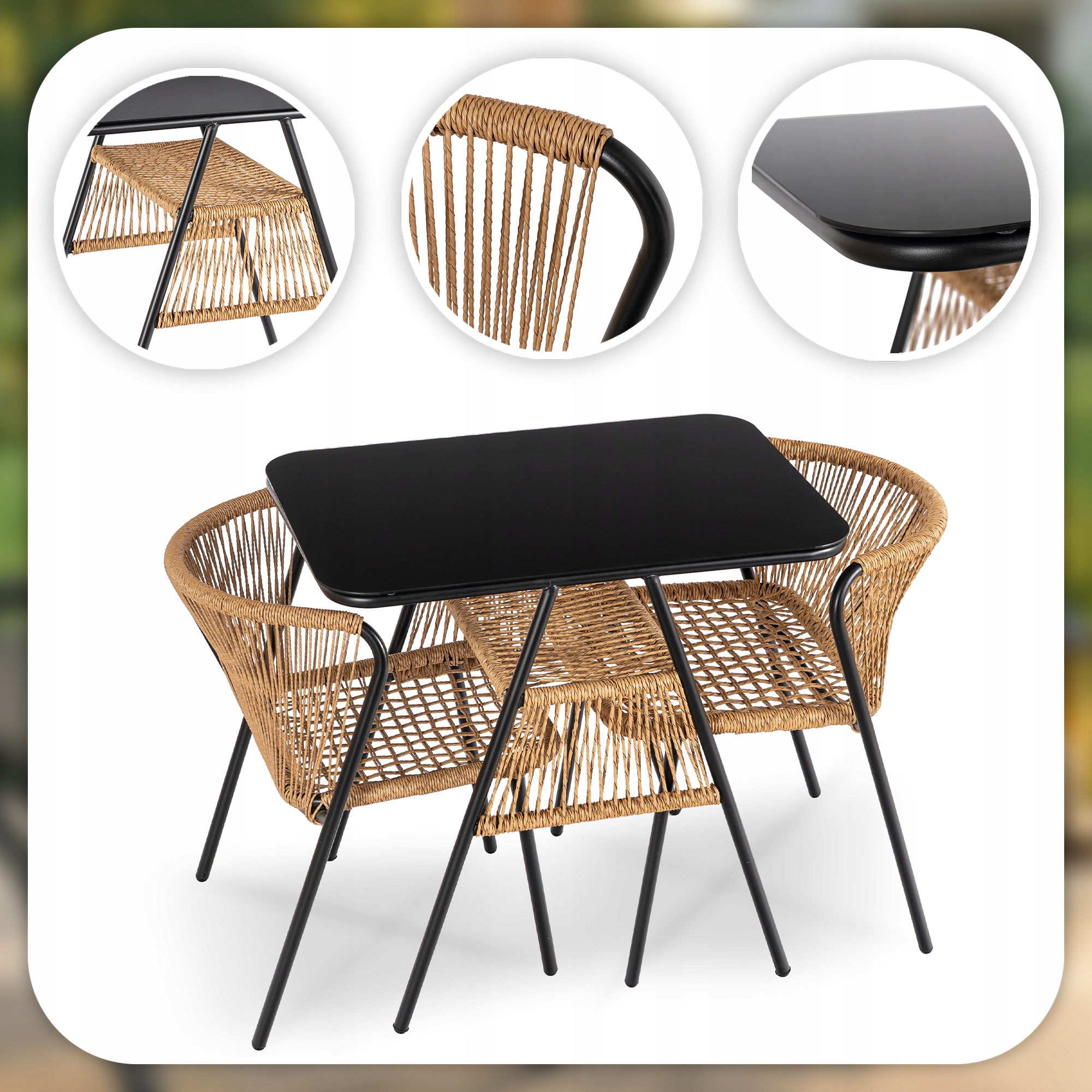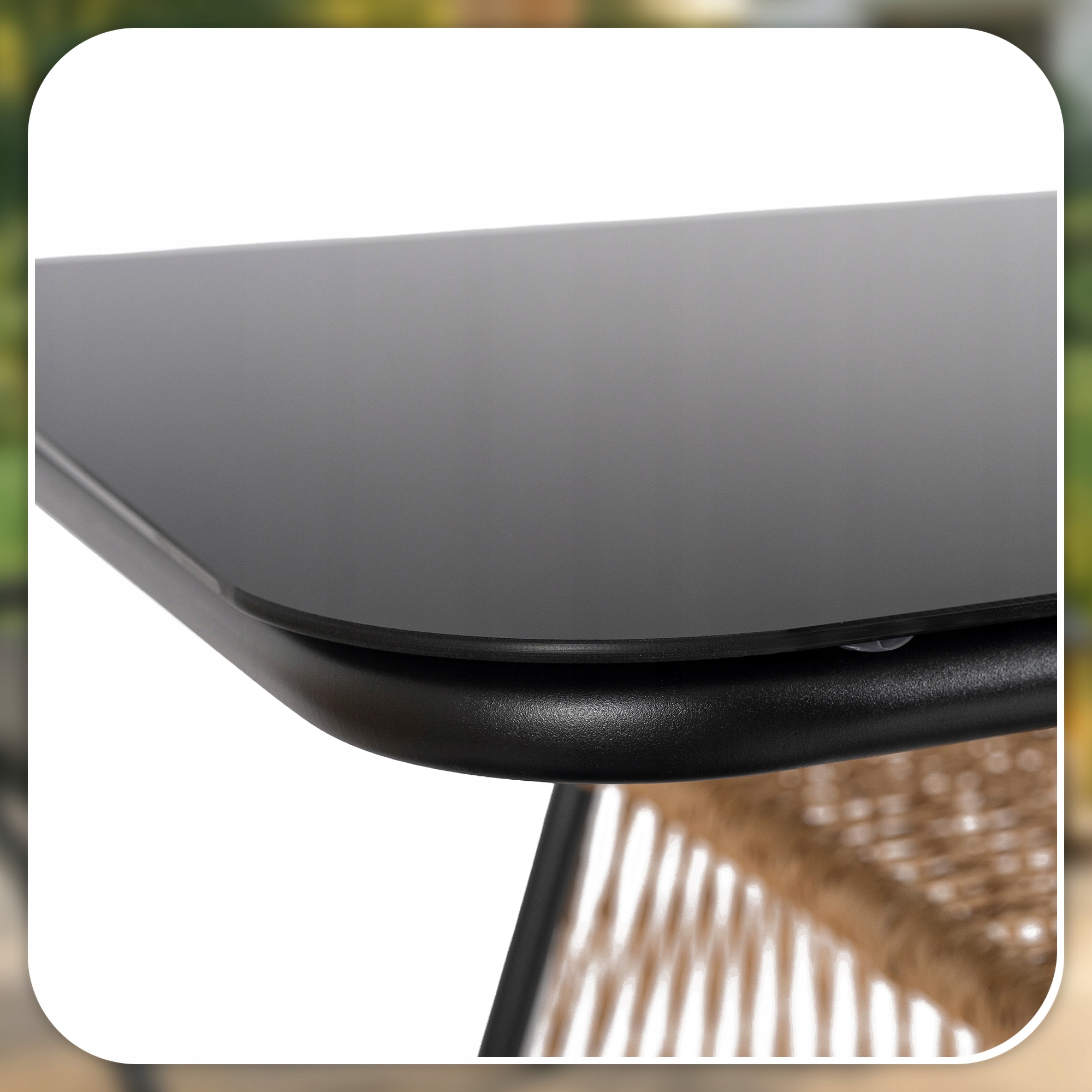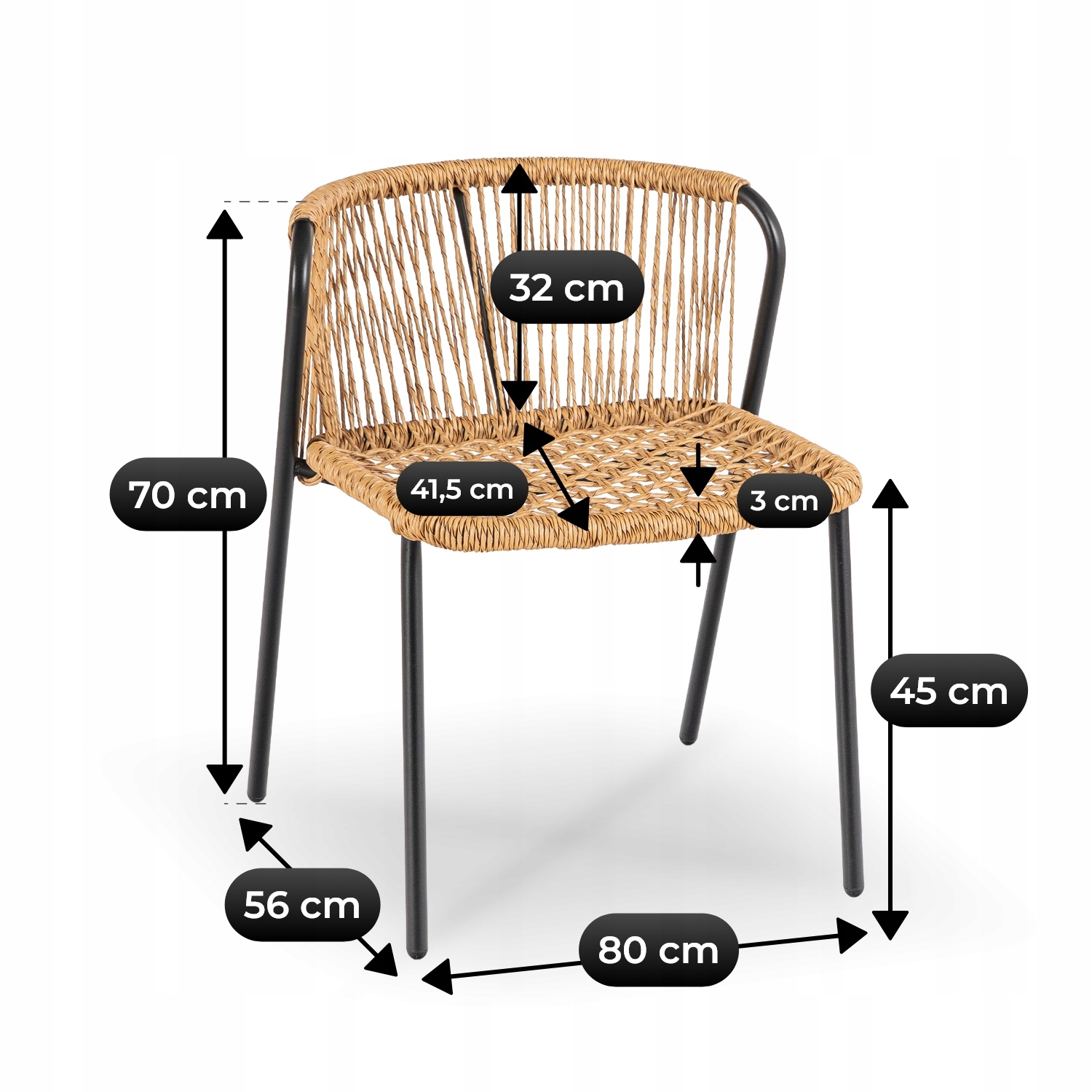 Zestaw TRISTE tworzy komfortową przestrzeń do wypoczynku na tarasie, balkonie lub w ogrodzie. Krzesła są lekkie, dzięki czemu można je swobodnie przestawiać i dopasować ustawienie do aktualnych potrzeb. Siedziska i oparcia wykonane są z plecionego rattanu w ciepłym, naturalnym kolorze. Plecionka jest gęsta i równomierna, co nadaje meblom estetyczny i elegancki wygląd, a jednocześnie zapewnia przewiewność i komfort użytkowania. To idealne miejsce na wspólne posiłki, spotkania z rodziną i relaks na świeżym powietrzu.