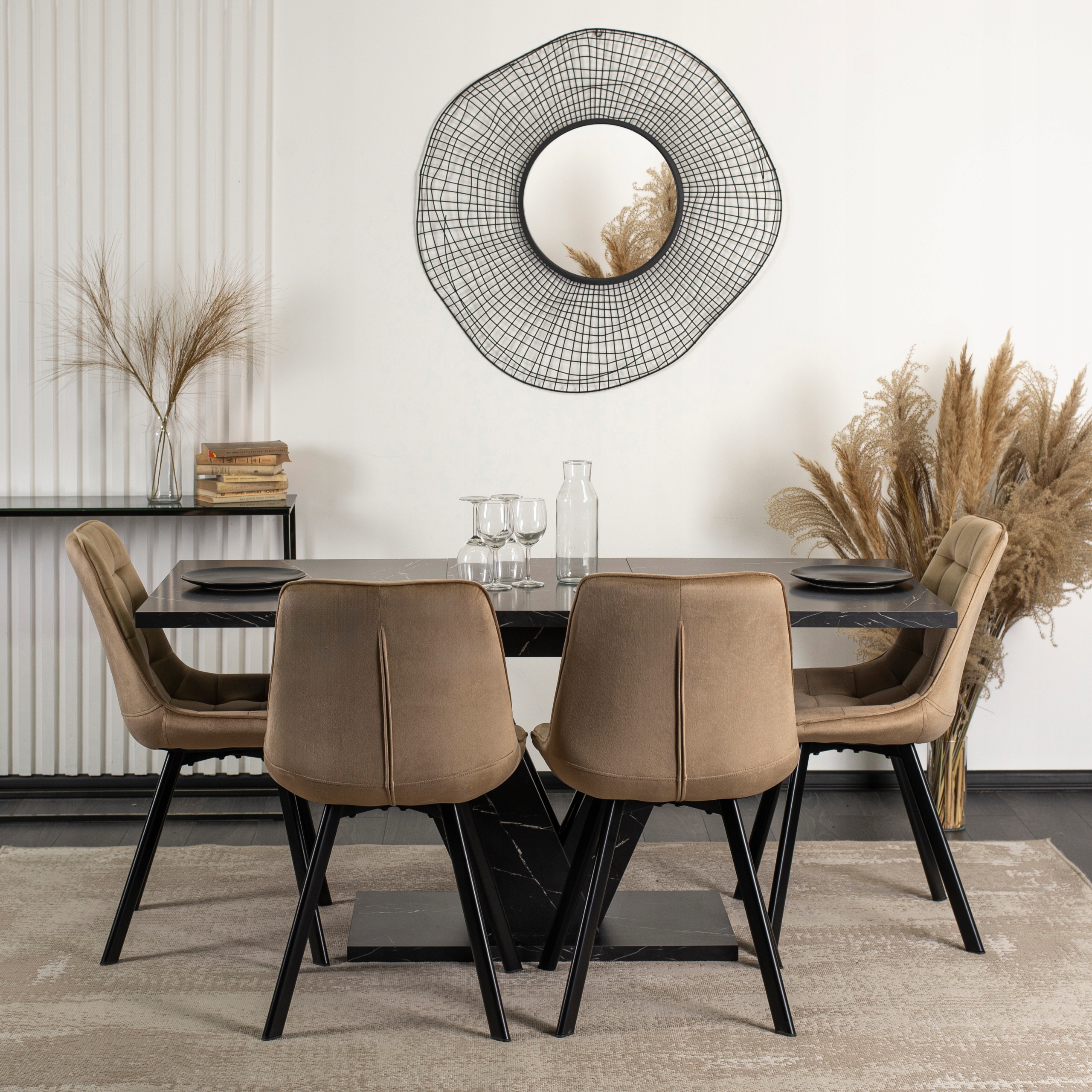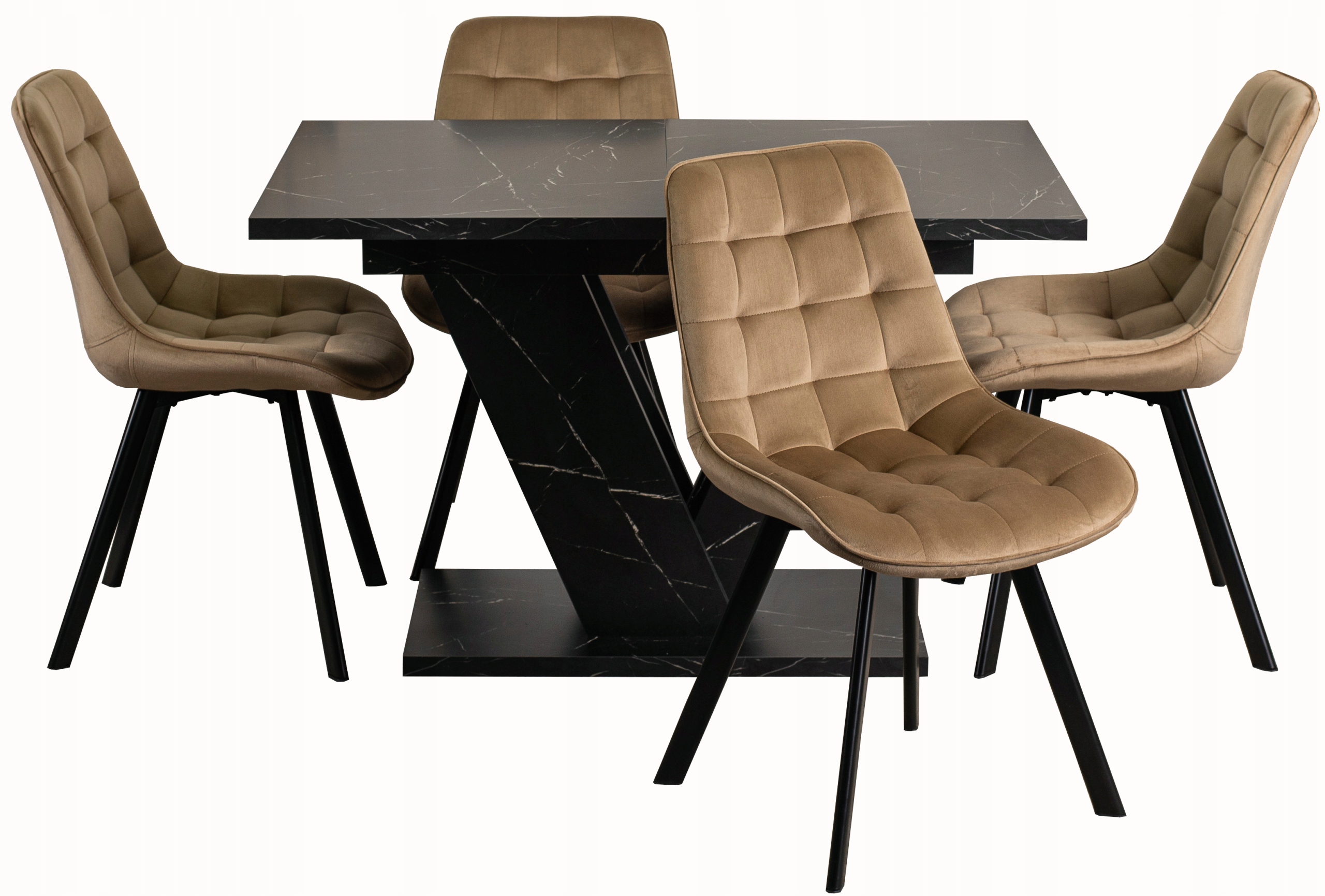 - Stół prostokątny i rozkładany CLARK w kolorze czarny marmur + 4x krzesło RICK beżowe z czarnymi nogami