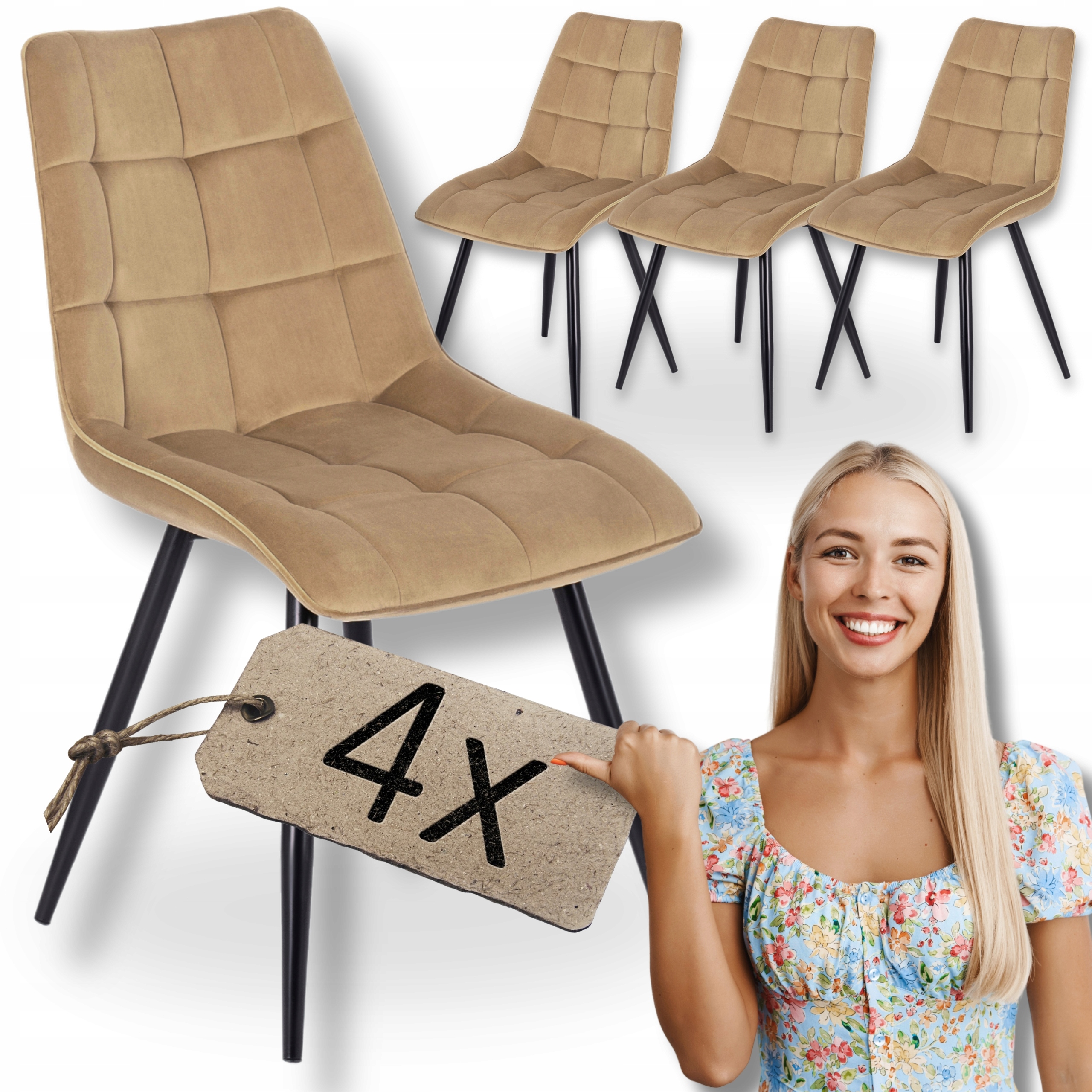 Zestaw 4x Krzesło Tapicerowane Welurowe Pikowane Do Jadalni Loft RIO Beż ⭐⭐⭐⭐⭐