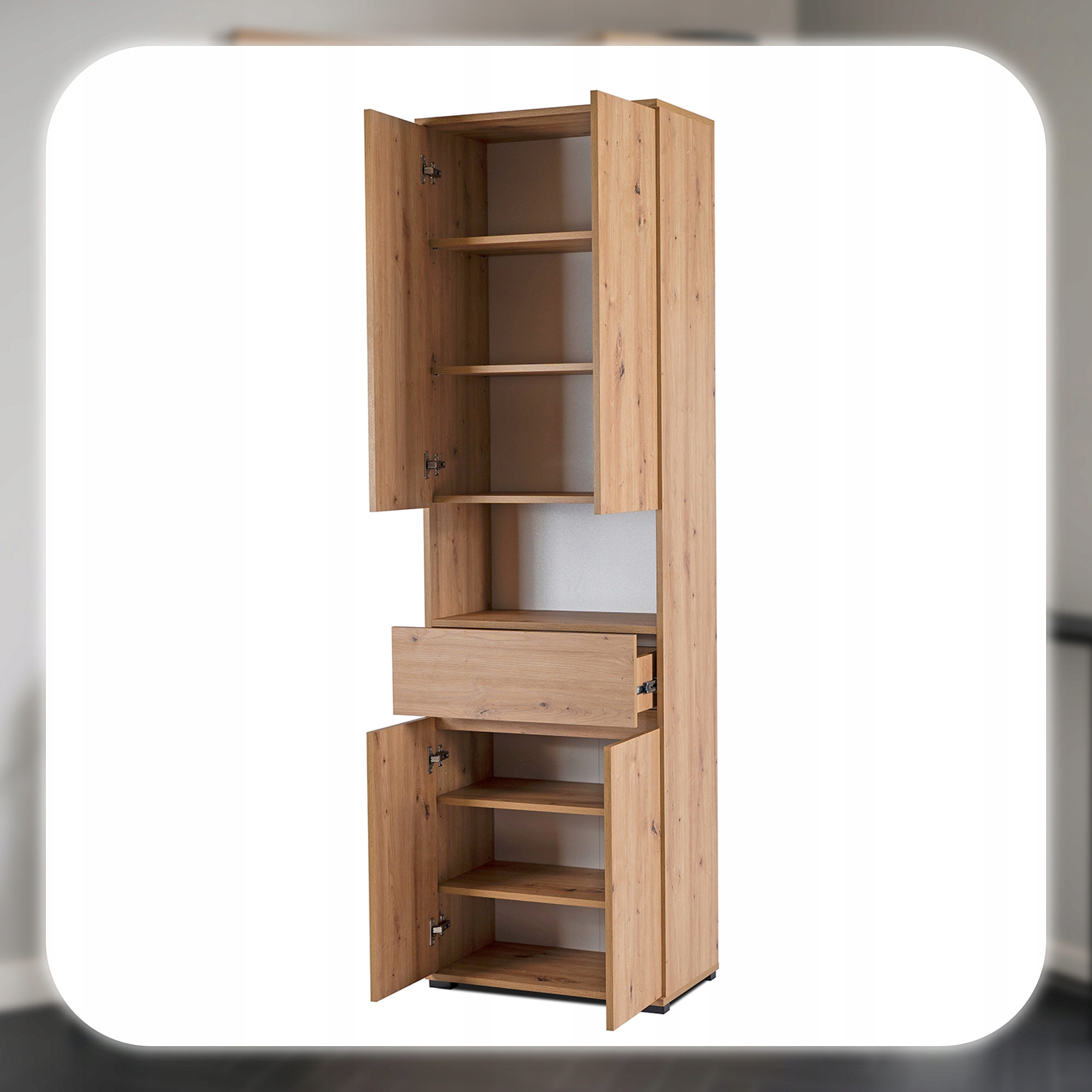 Nowoczesny zestaw do przedpokoju MODENA w kolorze dębu artisan to kompleksowe rozwiązanie, które łączy funkcjonalność i elegancki design. Składa się z praktycznej szafki na buty, wysokiego słupka z szufladą i szafkami oraz panelu ściennego z wieszakami. Dzięki przemyślanej konstrukcji z łatwością uporządkujesz przestrzeń i nadasz jej przytulny charakter.