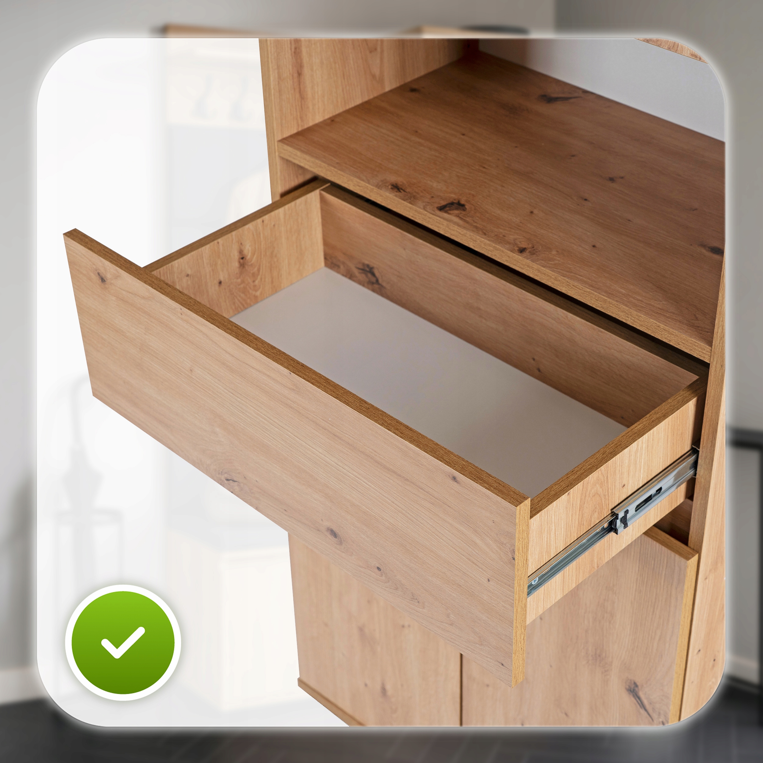 - Wygoda na co dzień – pojemne półki, praktyczna szuflada i dodatkowe schowki pozwalają uporządkować buty, ubrania i akcesoria.