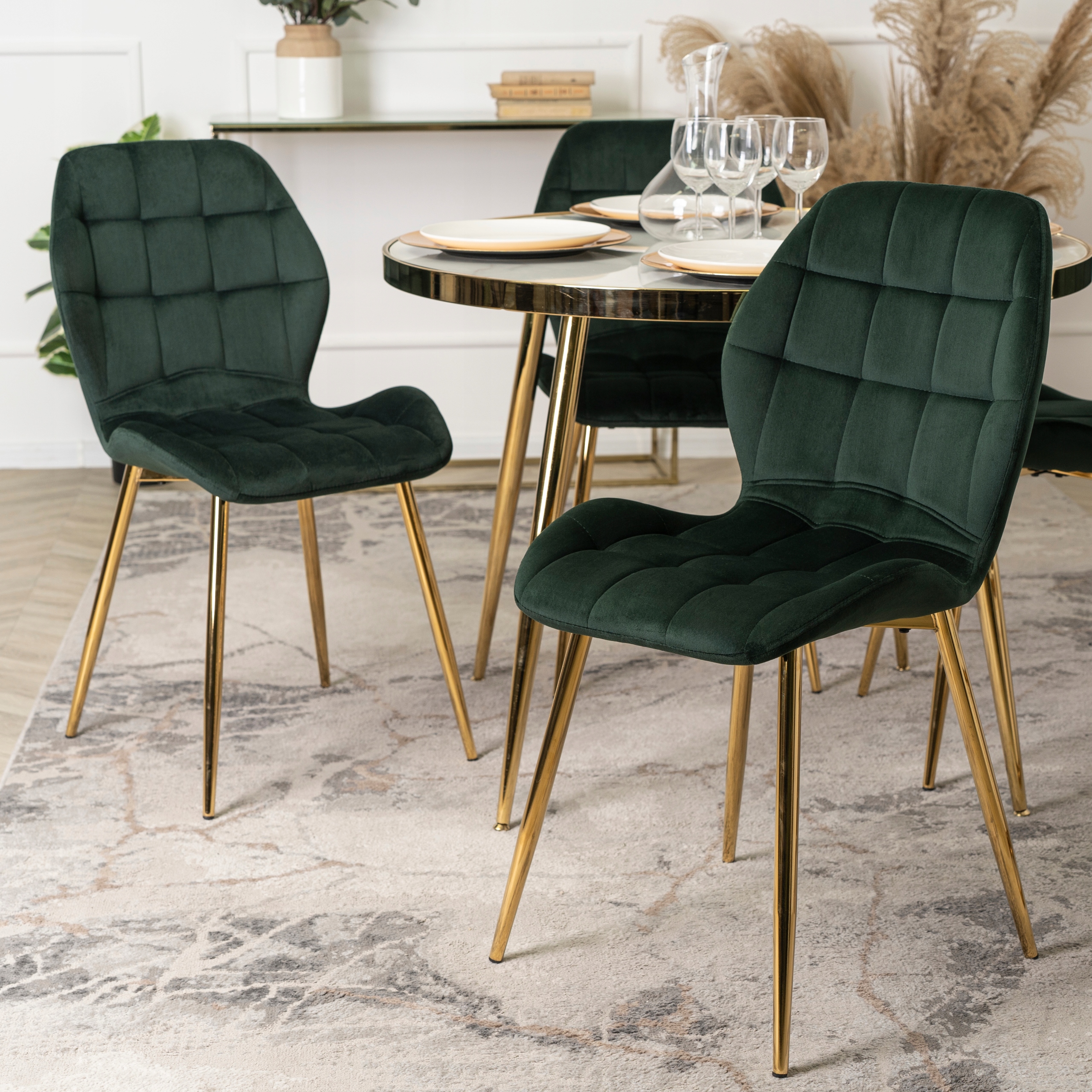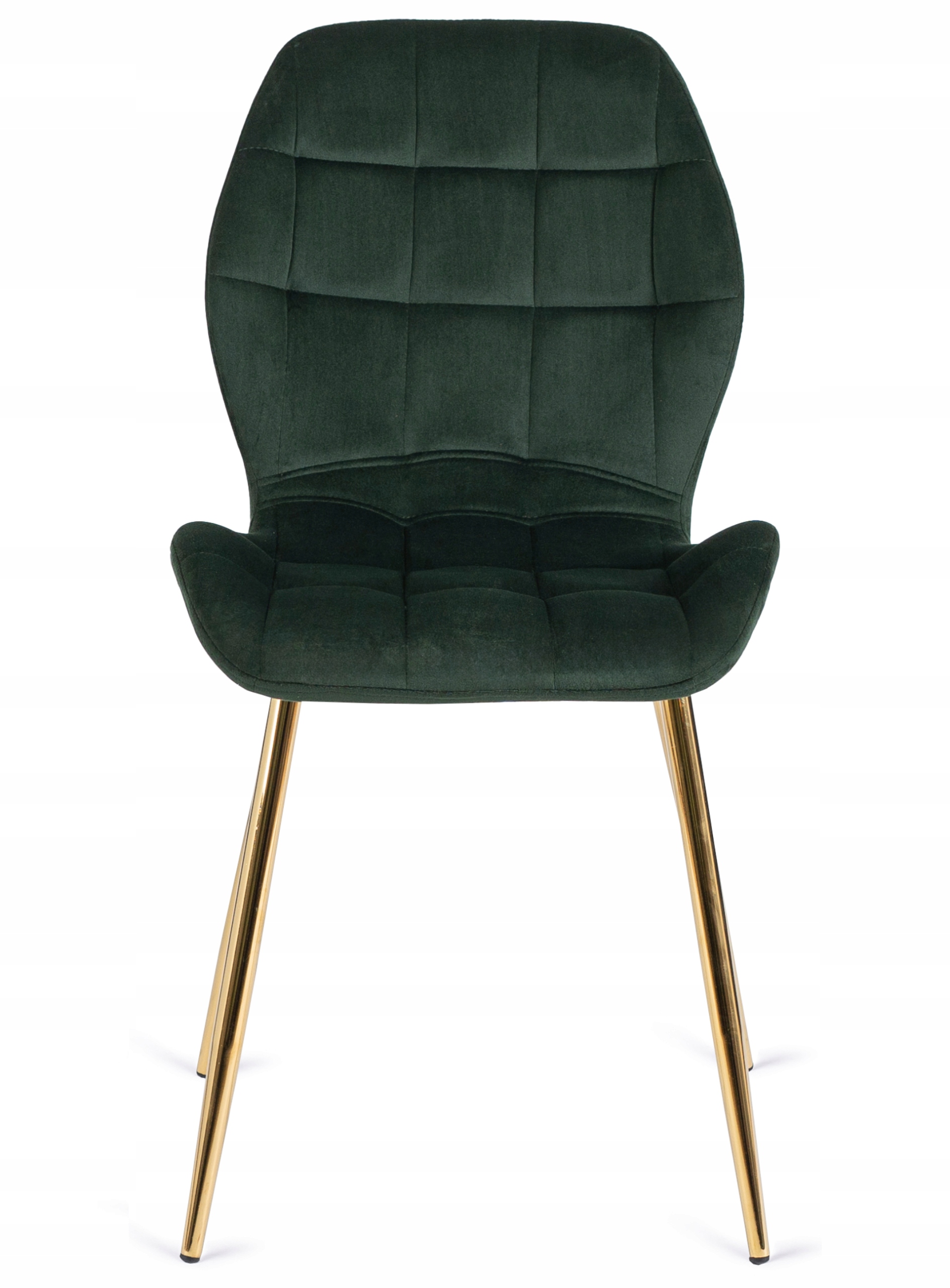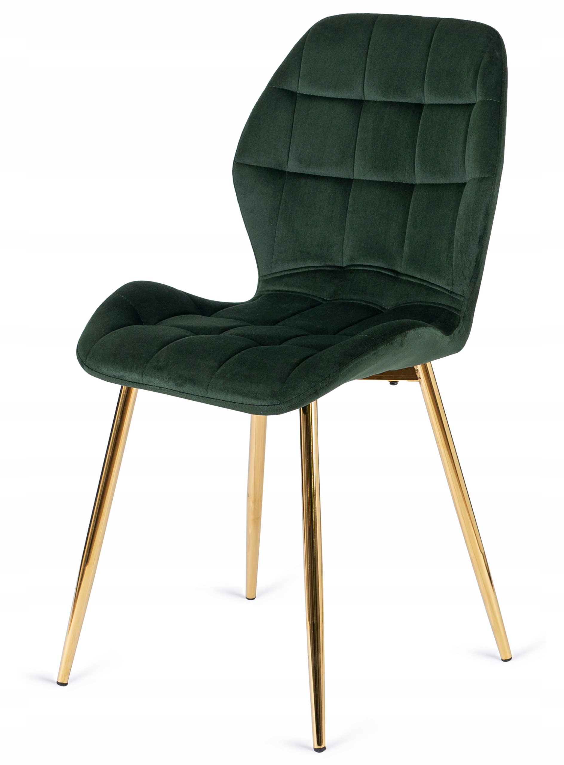 ⭐ Estetyka - tapicerkę stanowi wysokiej jakości tkanina welurowa z dekoracyjnym pikowaniem w kratę, a złoty kolor metalowych nóg podkreśla elegancki wygląd krzesła.