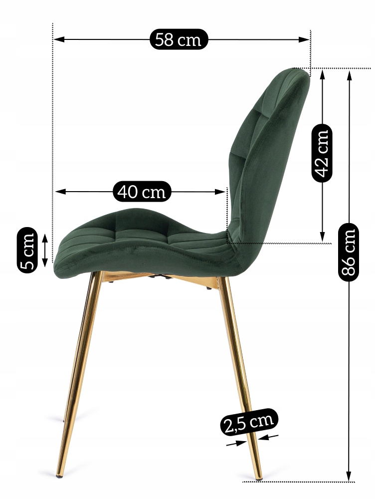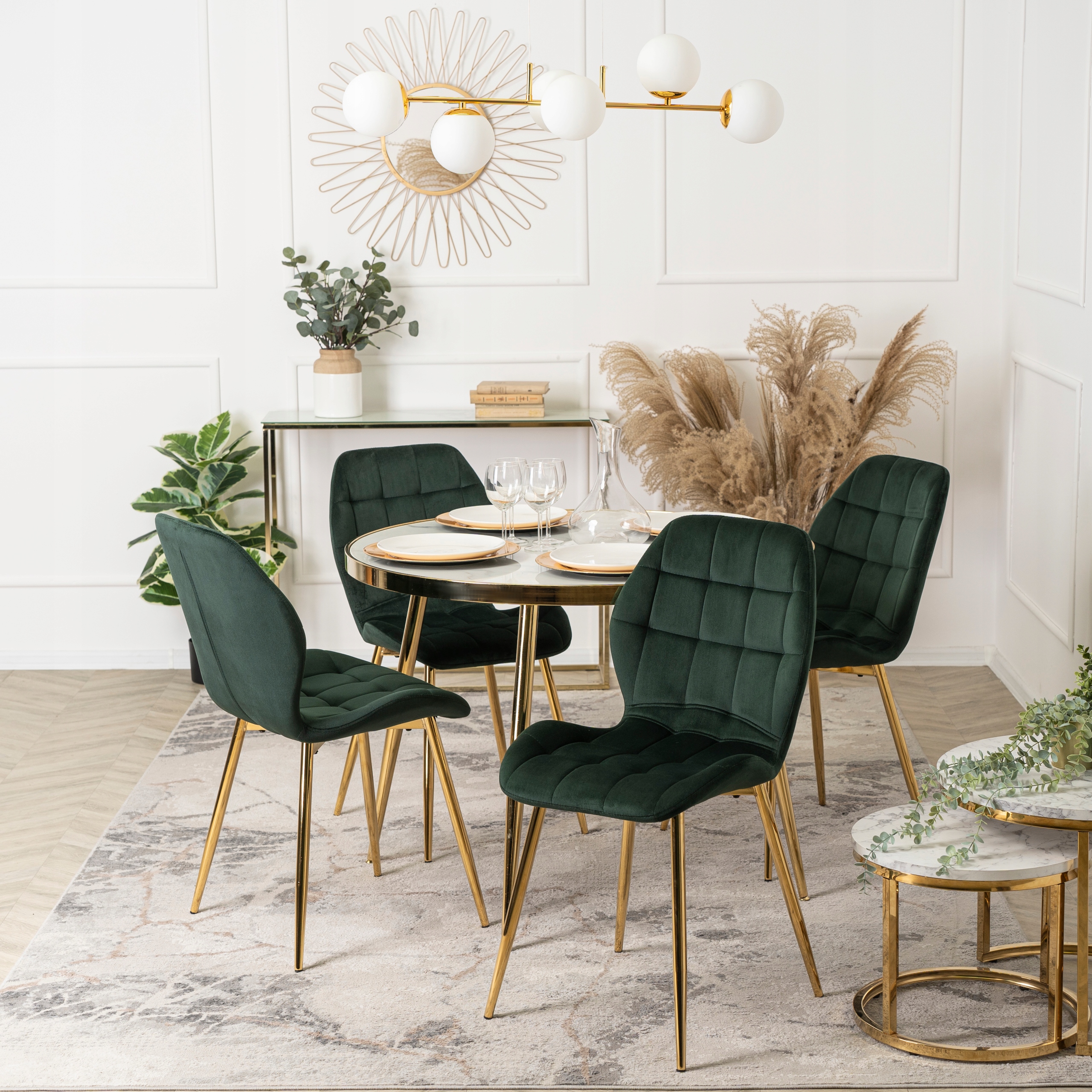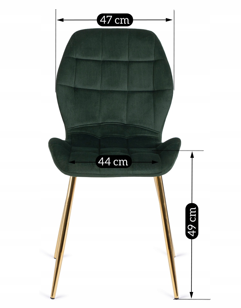 ⭐ Estetyka - tapicerkę stanowi wysokiej jakości tkanina welurowa z dekoracyjnym pikowaniem w kratę, a złoty kolor metalowych nóg podkreśla elegancki wygląd krzesła.