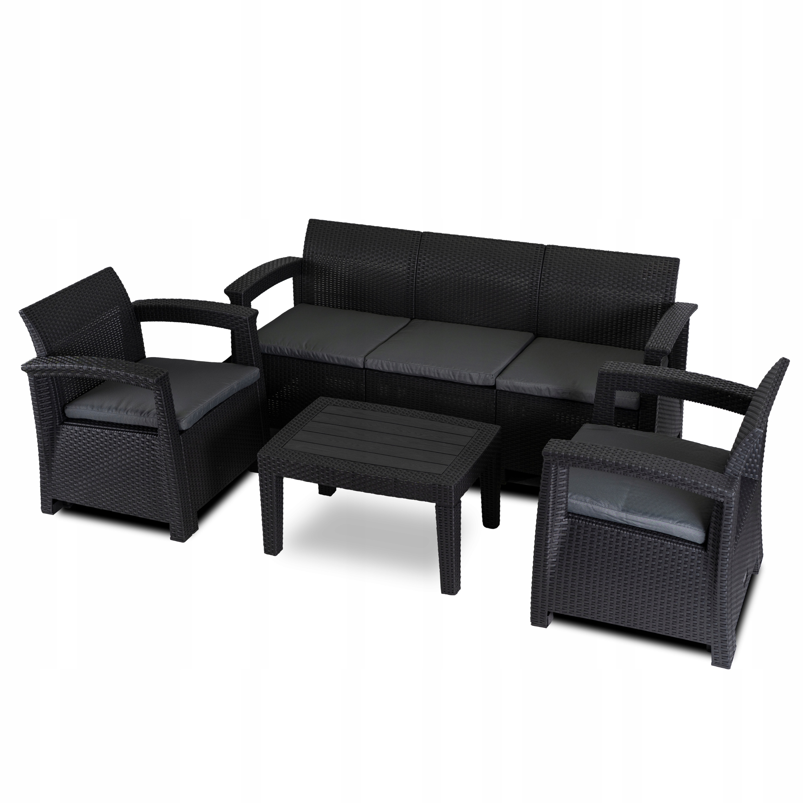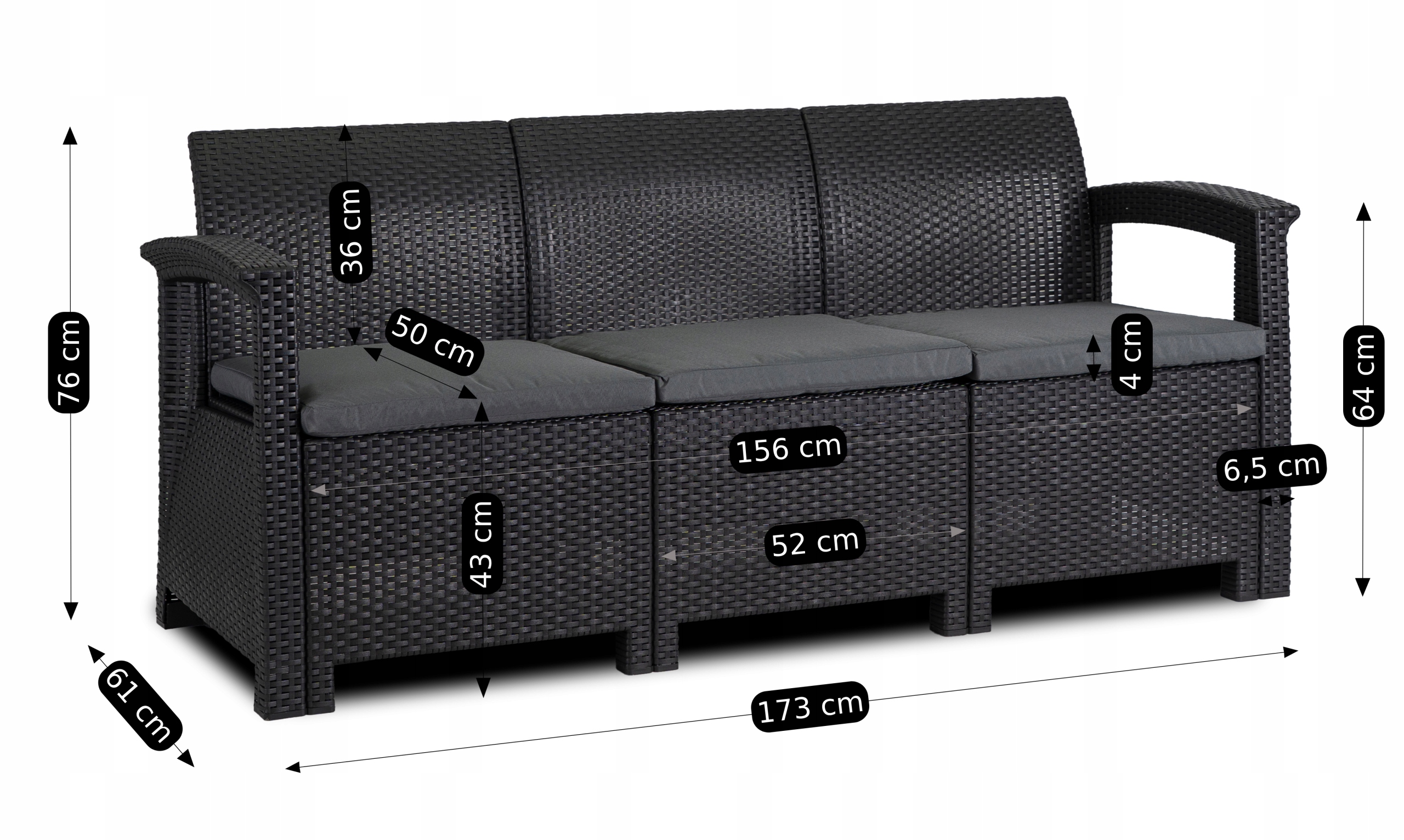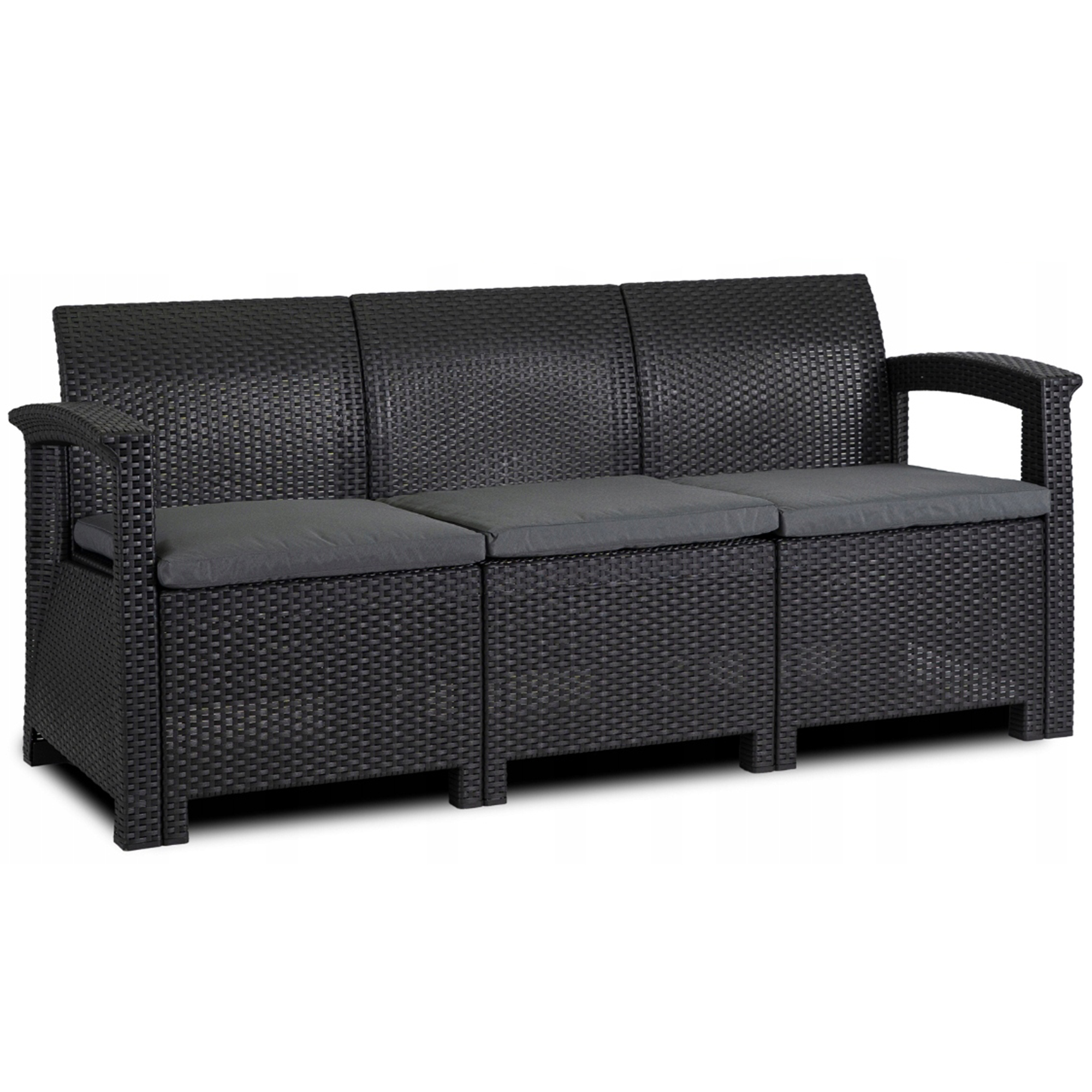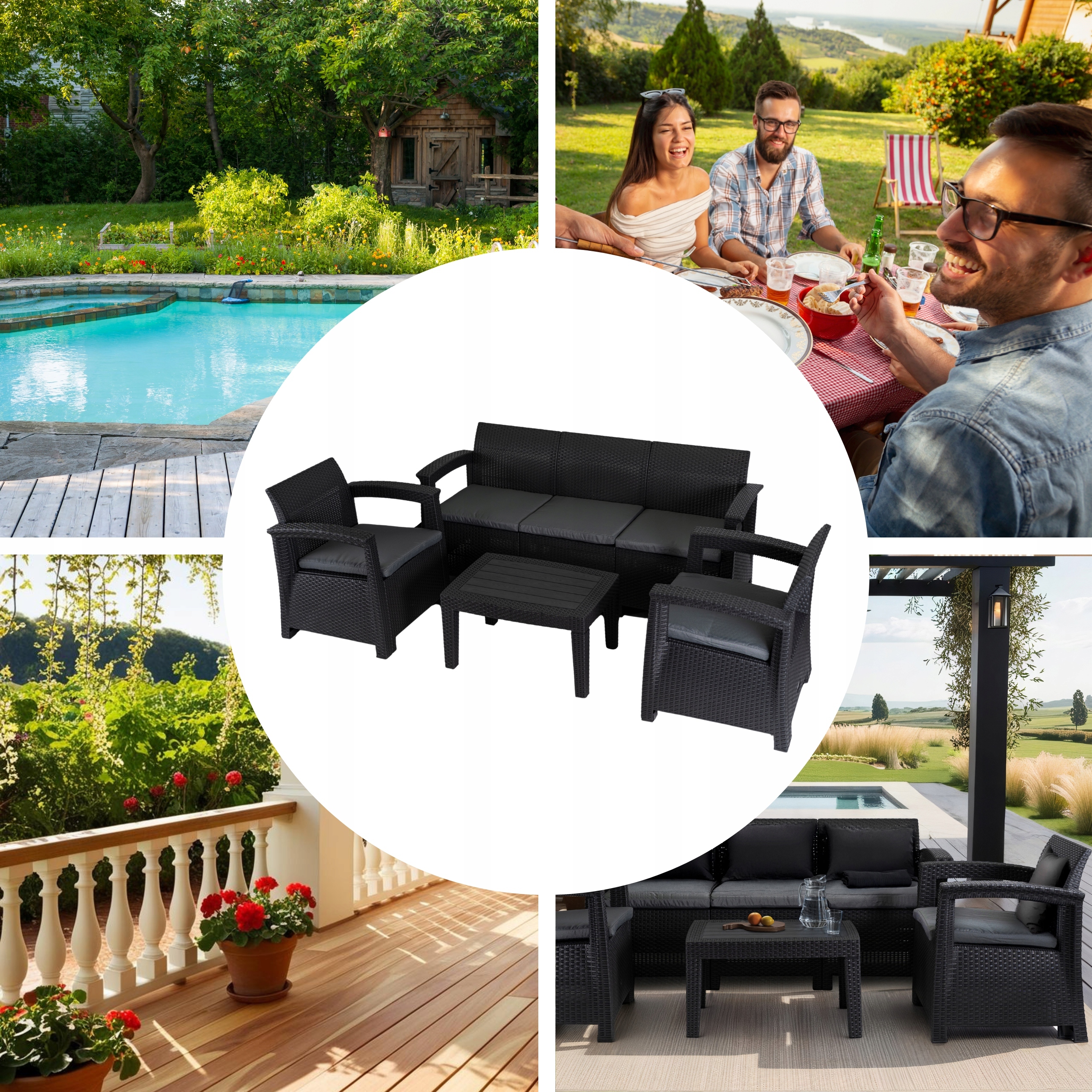 Sofa ogrodowa w klasycznym czarnym kolorze. Lekka, wygodna i idealna na taras, do ogrodu lub altanki. Miękkie poduszki na siedziskach zapewniają wysoki komfort. Odporna na warunki atmosferyczne i łatwa w czyszczeniu.