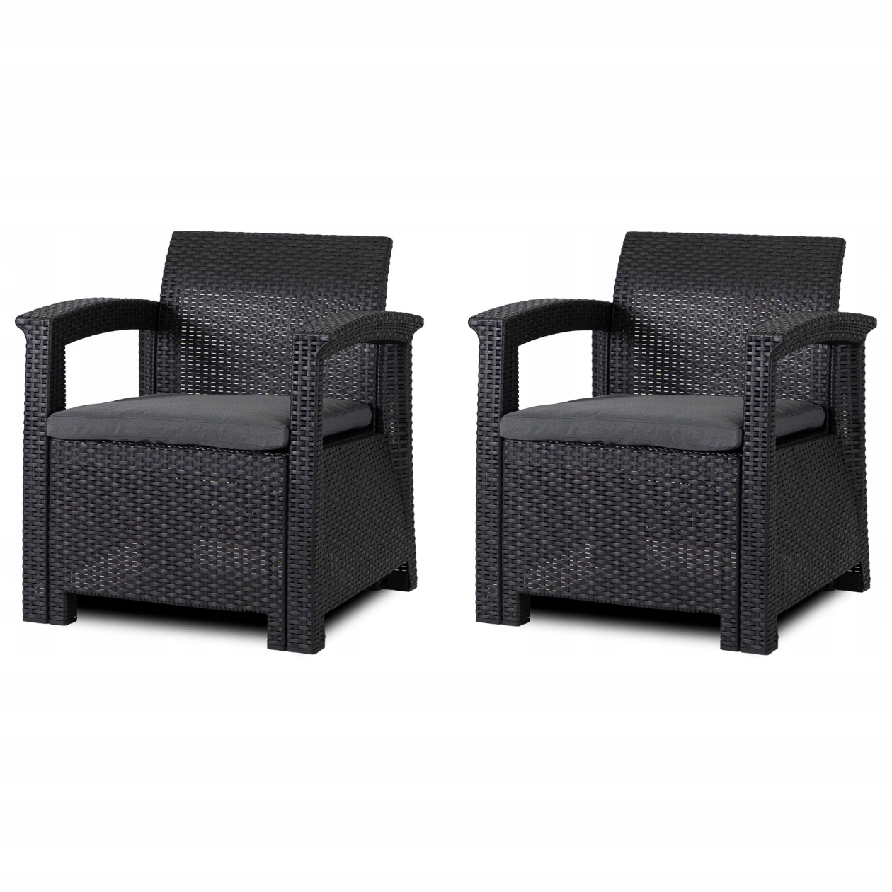 Fotele wykonane są z trwałego tworzywa sztucznego, które imituje technorattan i dobrze sprawdza się na zewnątrz.