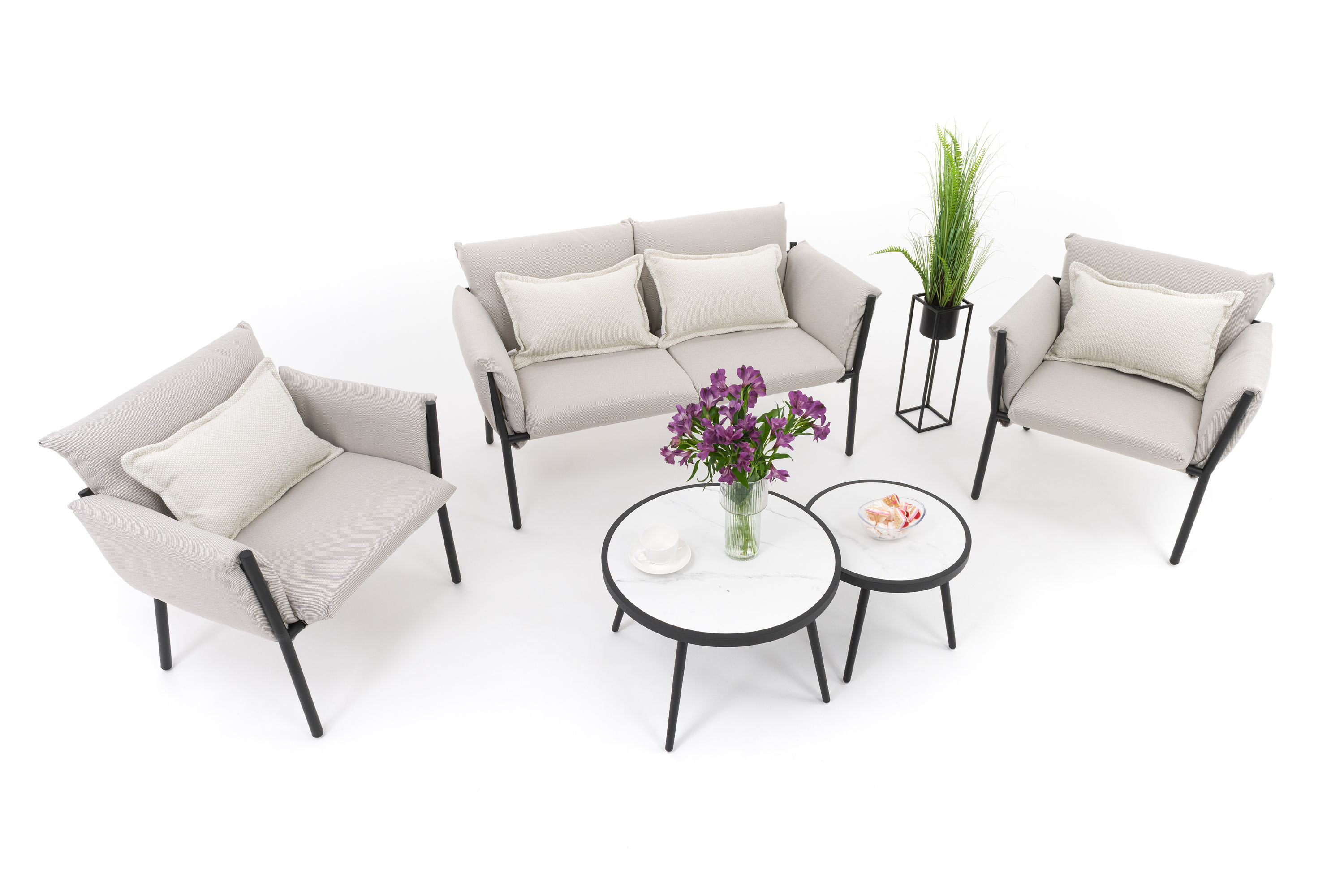Zestaw Tulum składa się z dwóch szerokich foteli, wygodnej dwuosobowej sofy oraz dwóch lekkich stolików – większego i mniejszego, które można zestawić razem lub rozstawić niezależnie. Dzięki temu możesz aranżować przestrzeń tak, jak chcesz, niezależnie od dostępnej powierzchni. Wszystkie elementy dostępne są również osobno, więc łatwo rozbudujesz swój zestaw o dodatkowe komponenty.