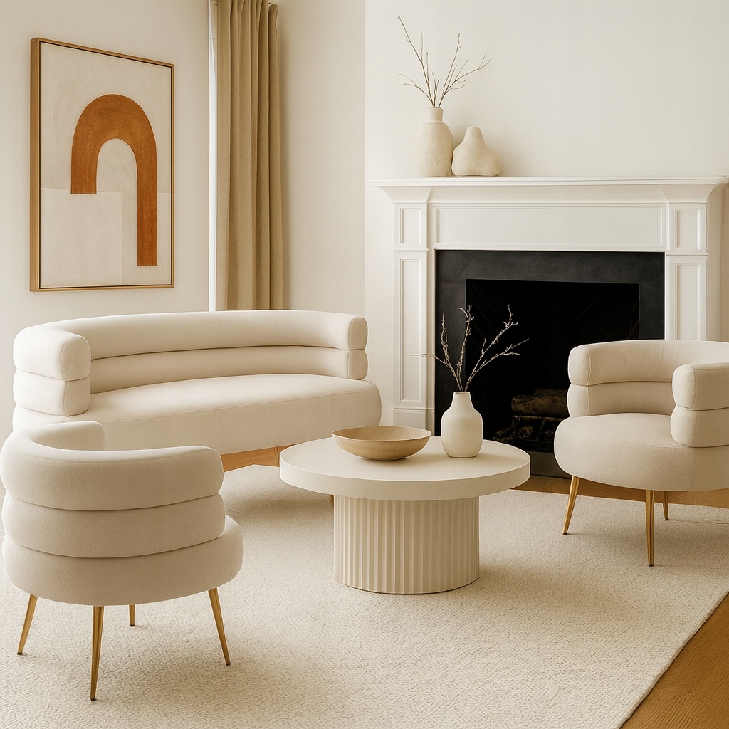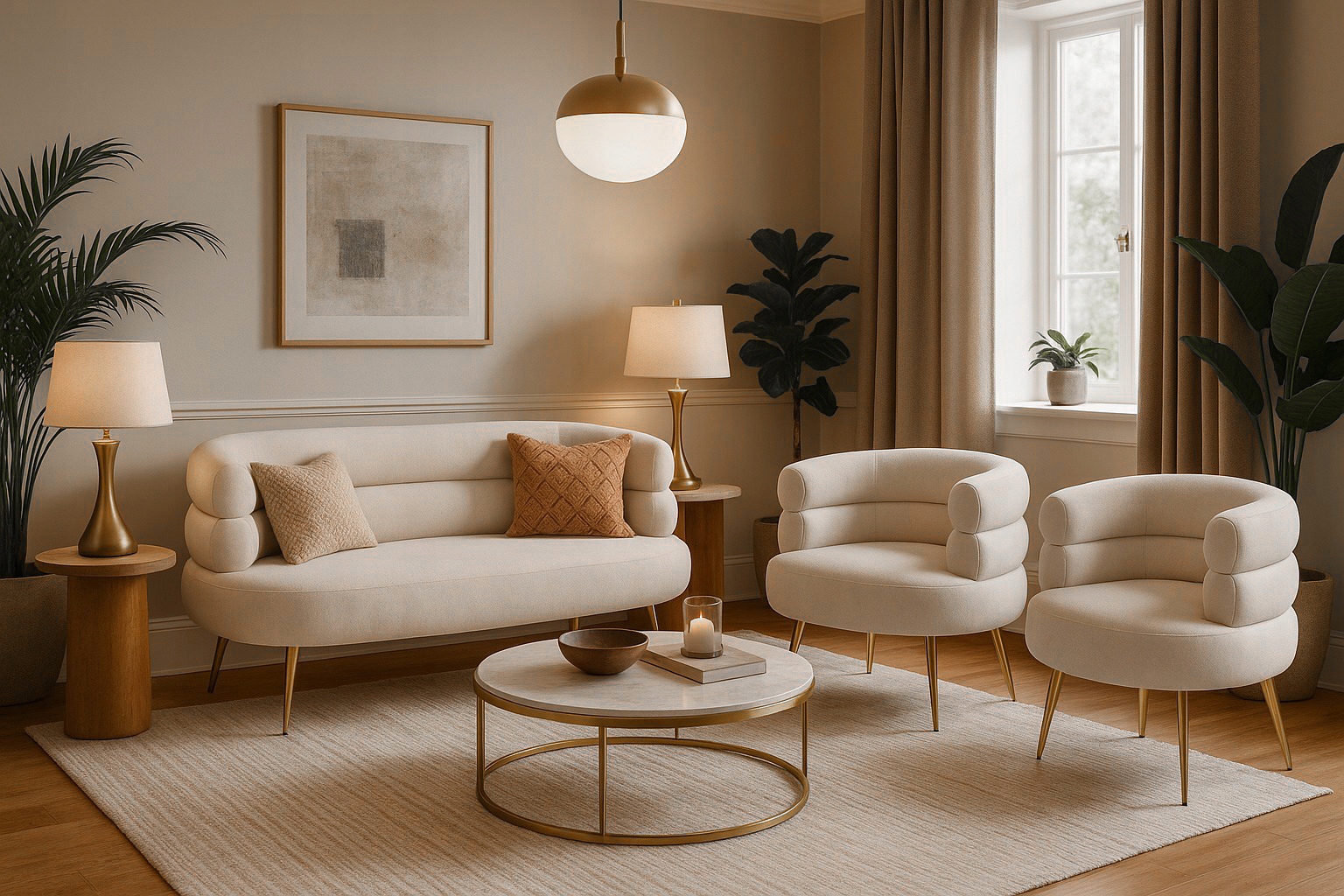 Elegancja i komfort w duecie – sofa i dwa fotele, które przyciągają spojrzenia i tworzą spójną, stylową całość. Kremowy odcień tapicerki sprawia, że komplet doskonale komponuje się z różnymi aranżacjami – od nowoczesnych, minimalistycznych wnętrz po bardziej klasyczne przestrzenie. Smukłe, złote nóżki dodają całości luksusowego charakteru i subtelnej lekkości.