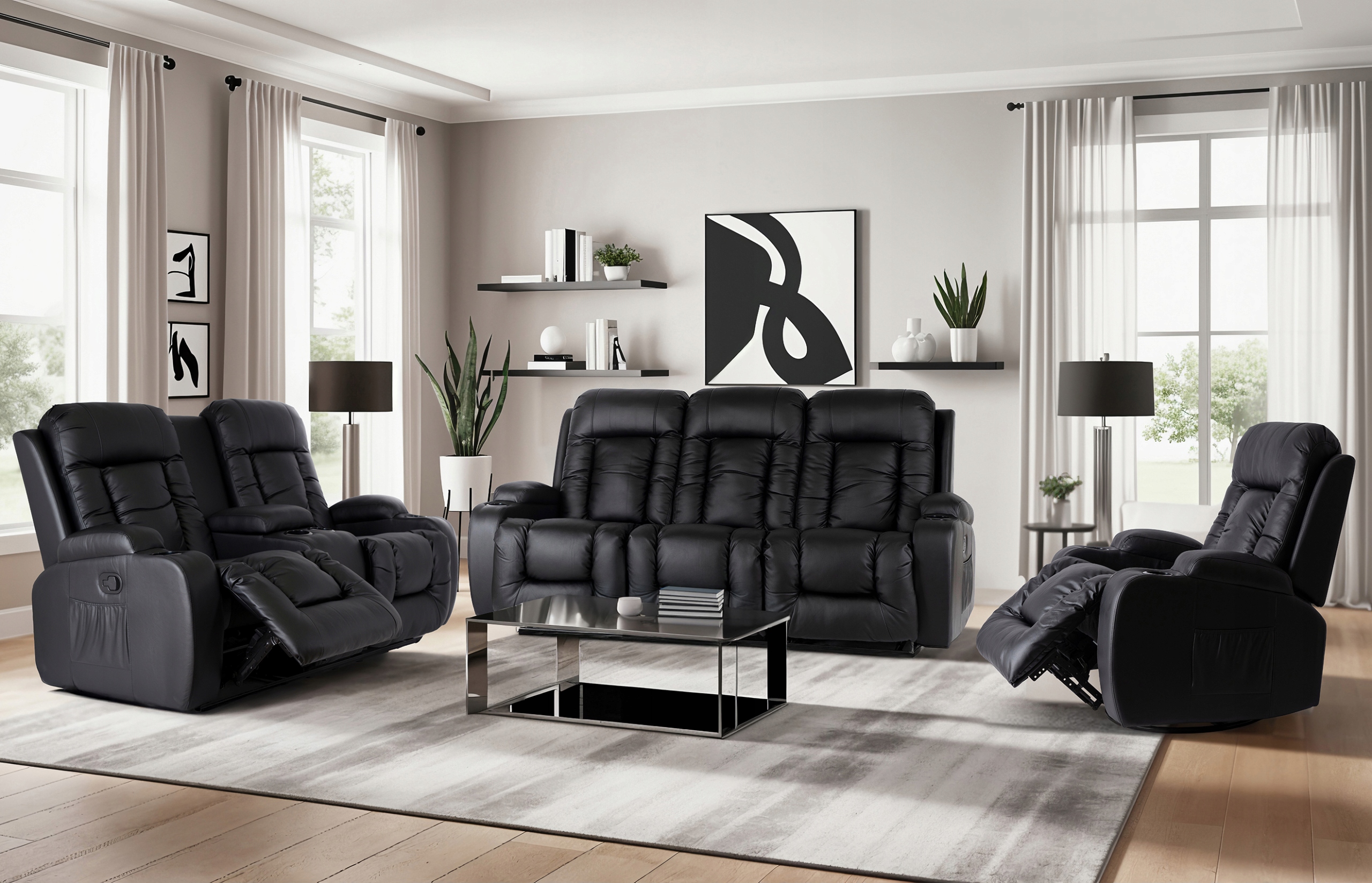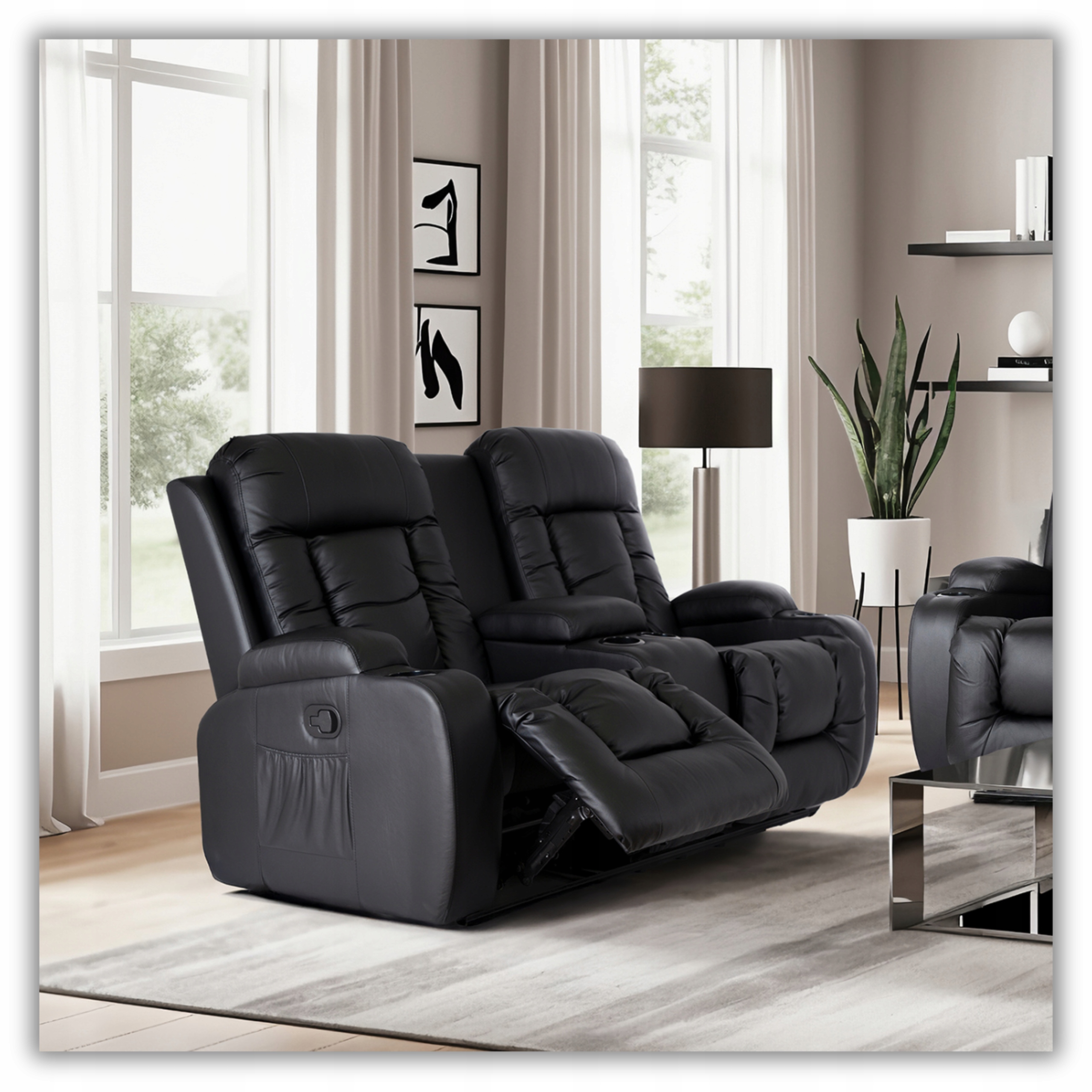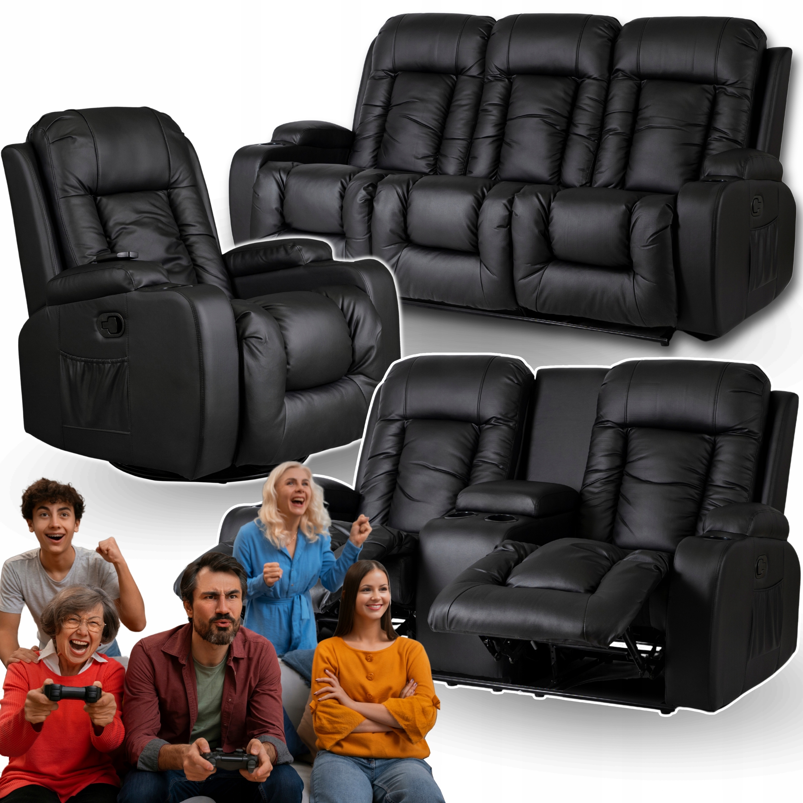 Zestaw Sofa Kanapa + Fotel Dwuosobowy + Fotel Rozkładany Masujący Czarny ⭐⭐⭐⭐⭐