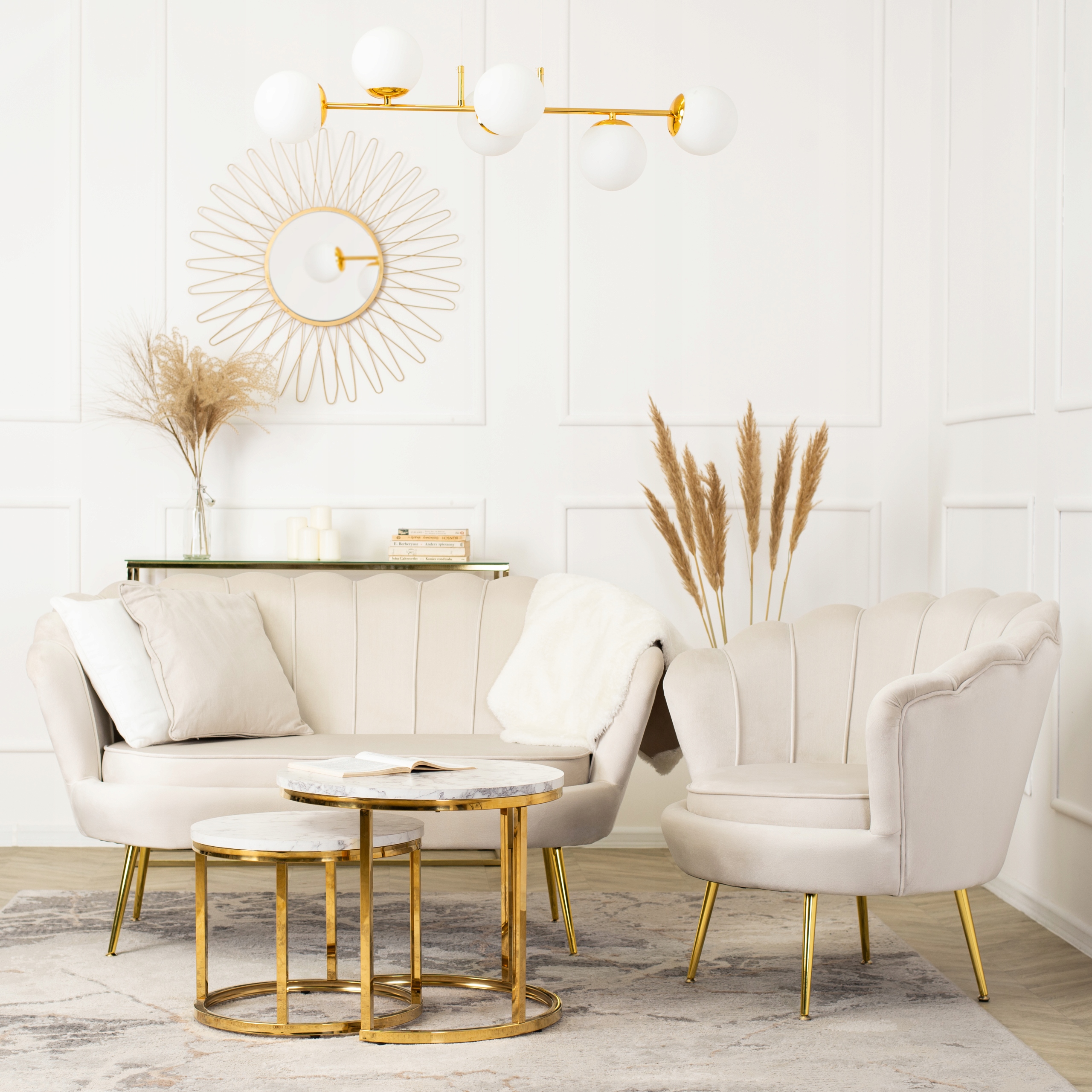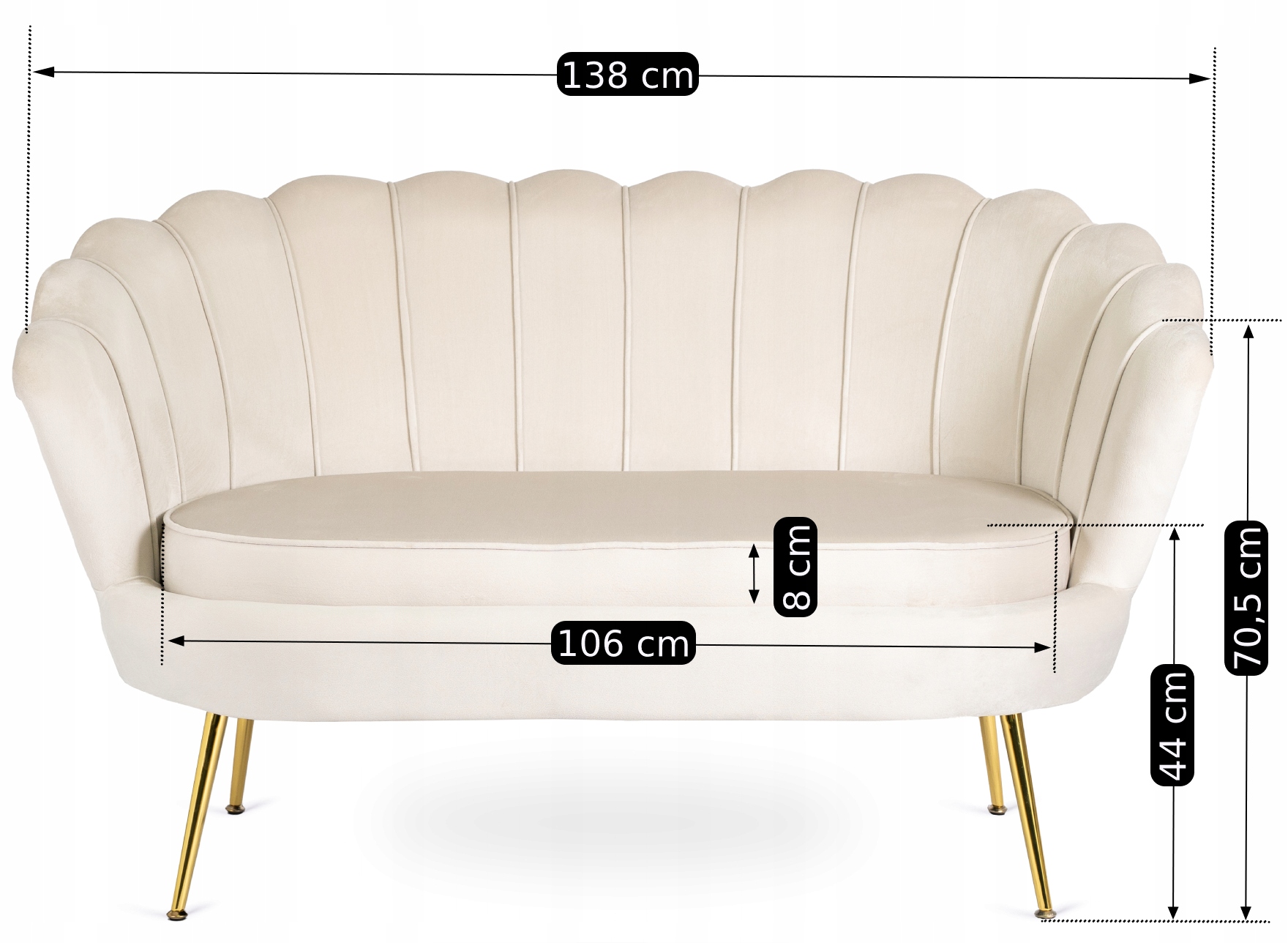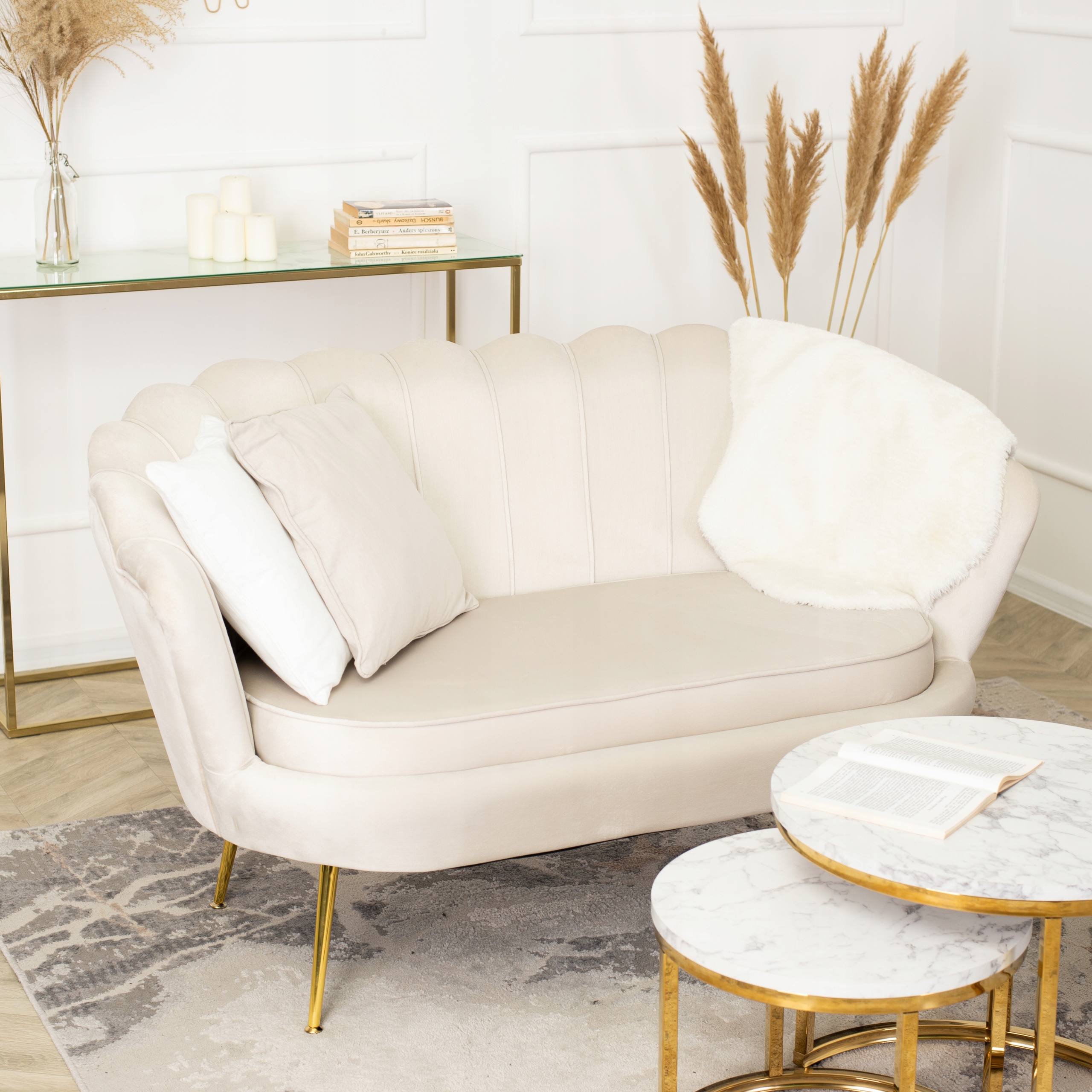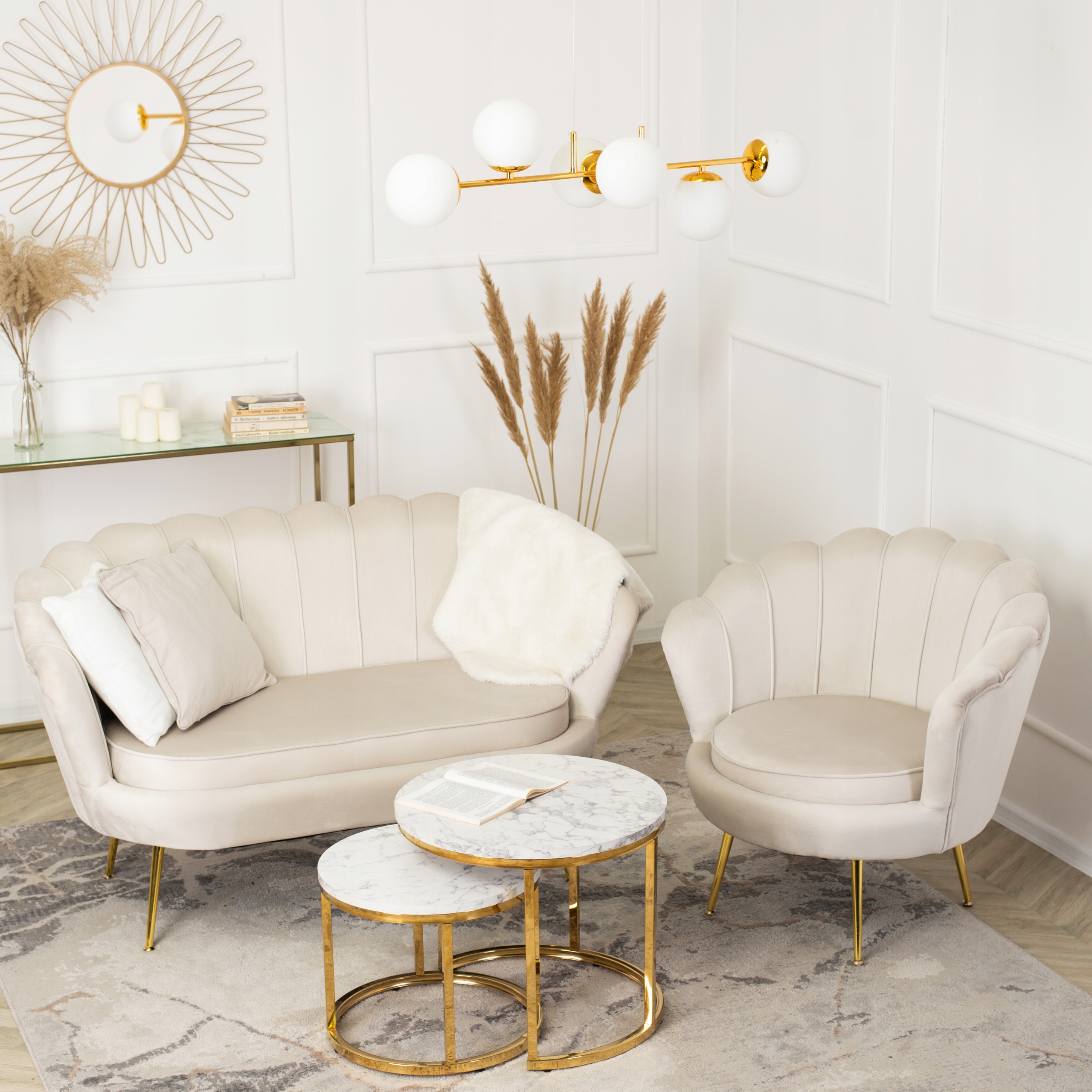 Zestaw Sofa Kremowa i Fotel Krem Muszelka Meble Wypoczynkowe Glamour Złote ⭐⭐⭐⭐⭐