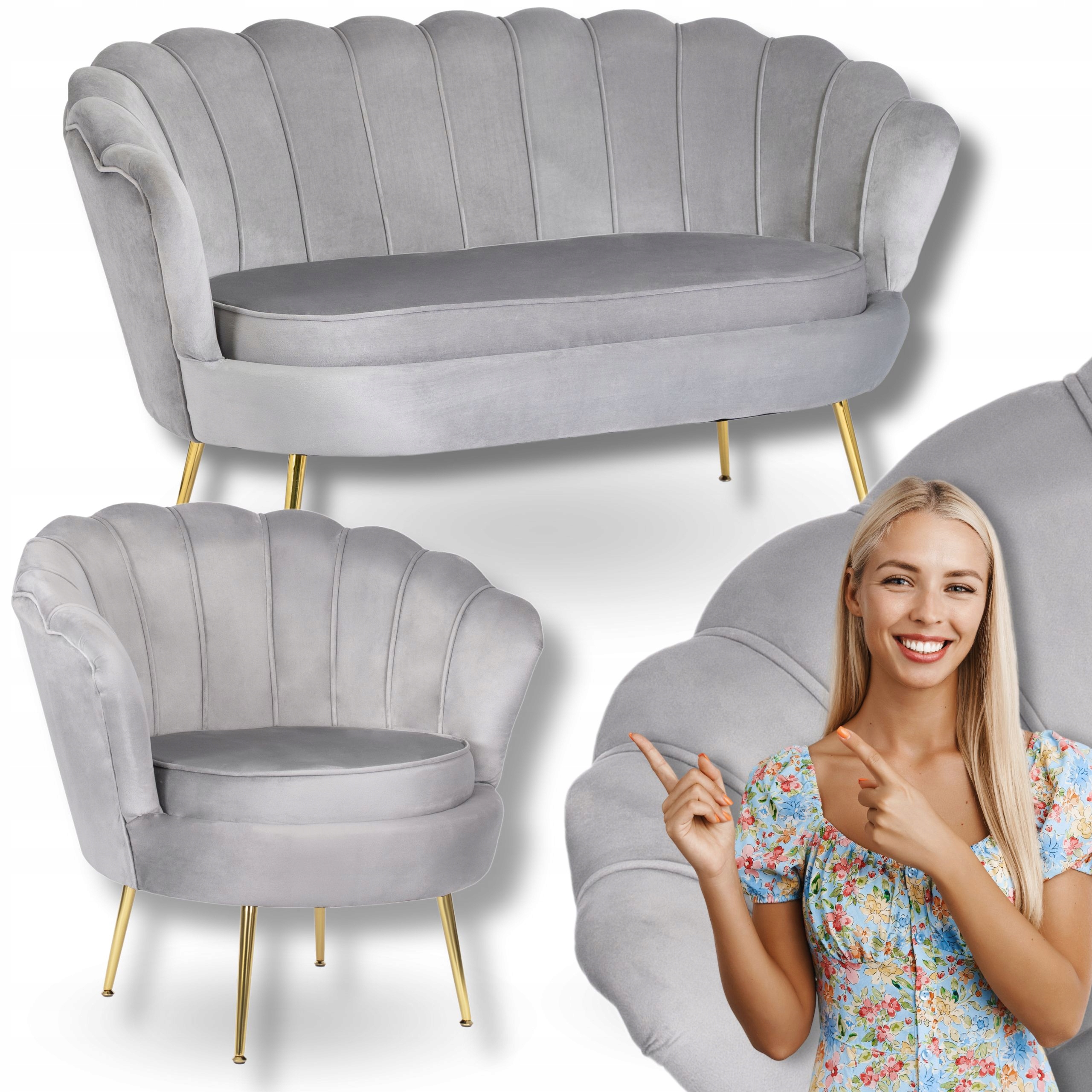Zestaw Sofa Szara i Fotel Szary Muszelka Meble Wypoczynkowe Glamour Złote ⭐⭐⭐⭐⭐